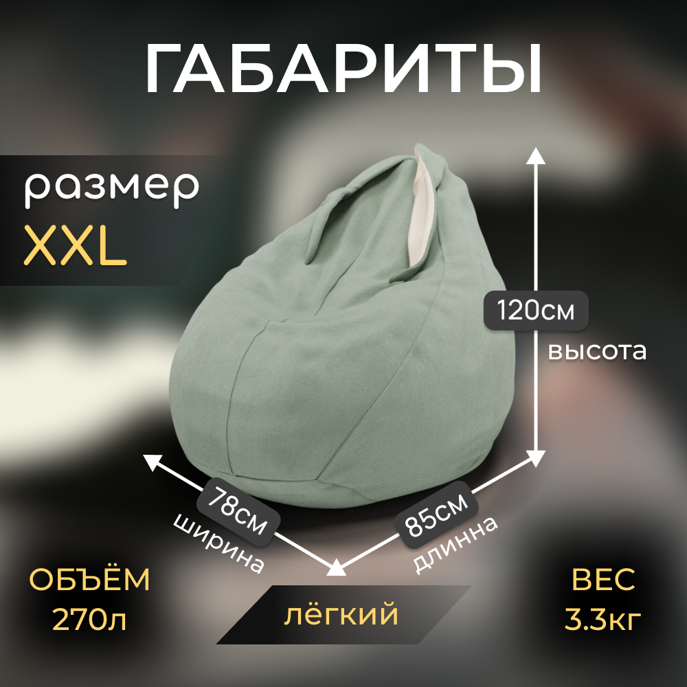 Кресло-мешок с ушками "Банни" для детей, зеленый, велютта 33 размер XXL. Для детской, гостиной