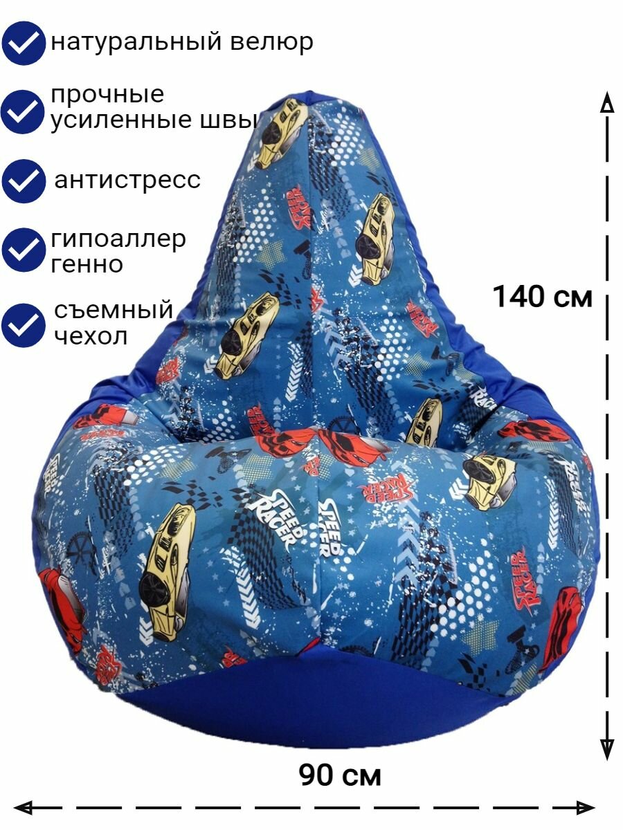 Купить Кресло-Мешок груша Тачки синий 140х90 размер XXXL, Чудо Кресло, Велюр Оксфорд, ручка, люверс, молния, детский пуф мешок
