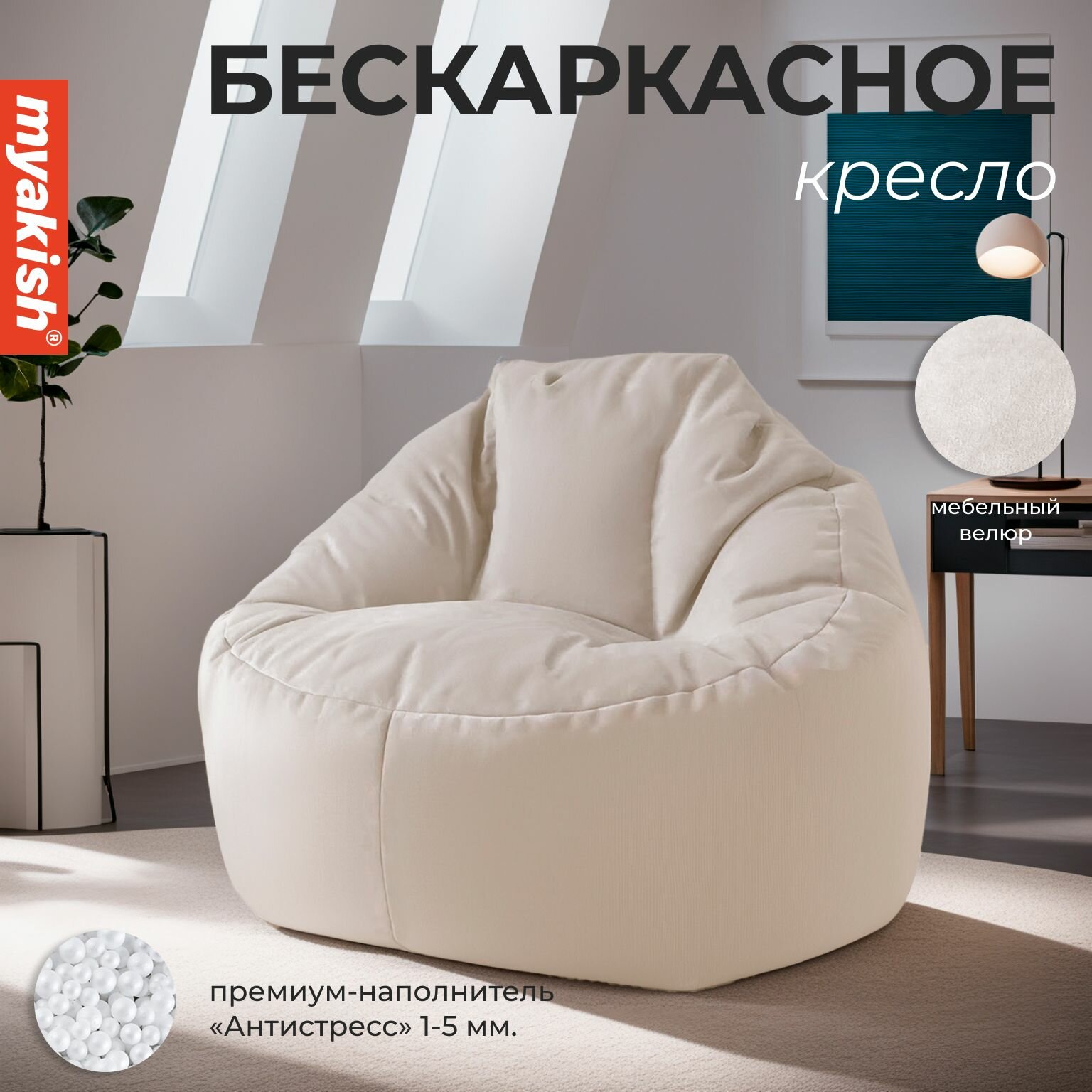 Бескаркасное кресло Myakish "Прайм", велюровое покрытие, наполнитель из пенополистирола