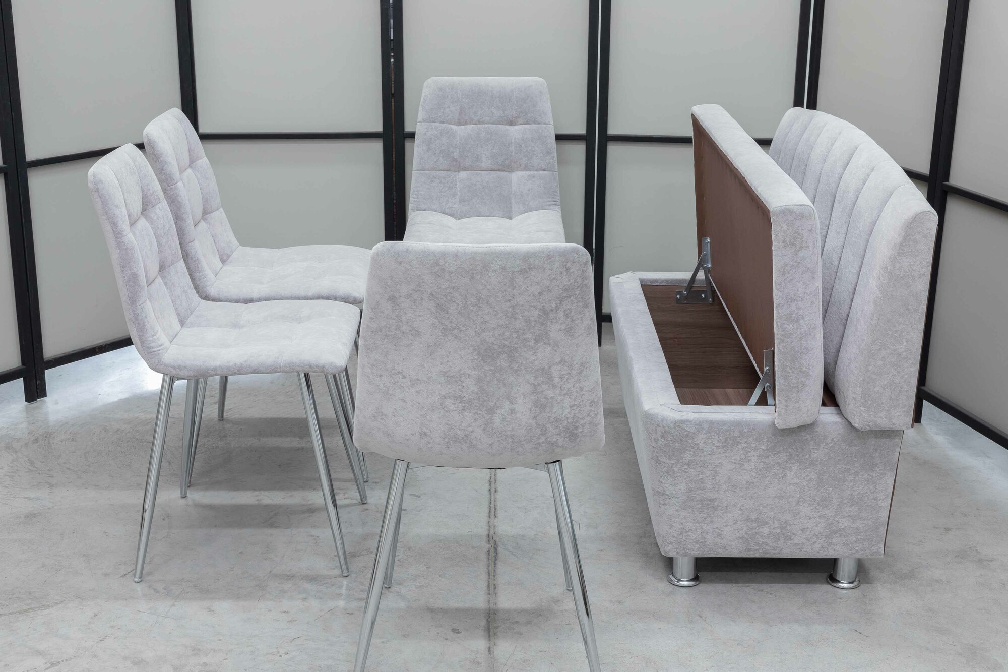 СохранитьКухонный диван Альт с 4-мя стульями, 120х56 см, обивка моющаяся, антивандальная, антикоготь, цвет - светло-серый. интересное: