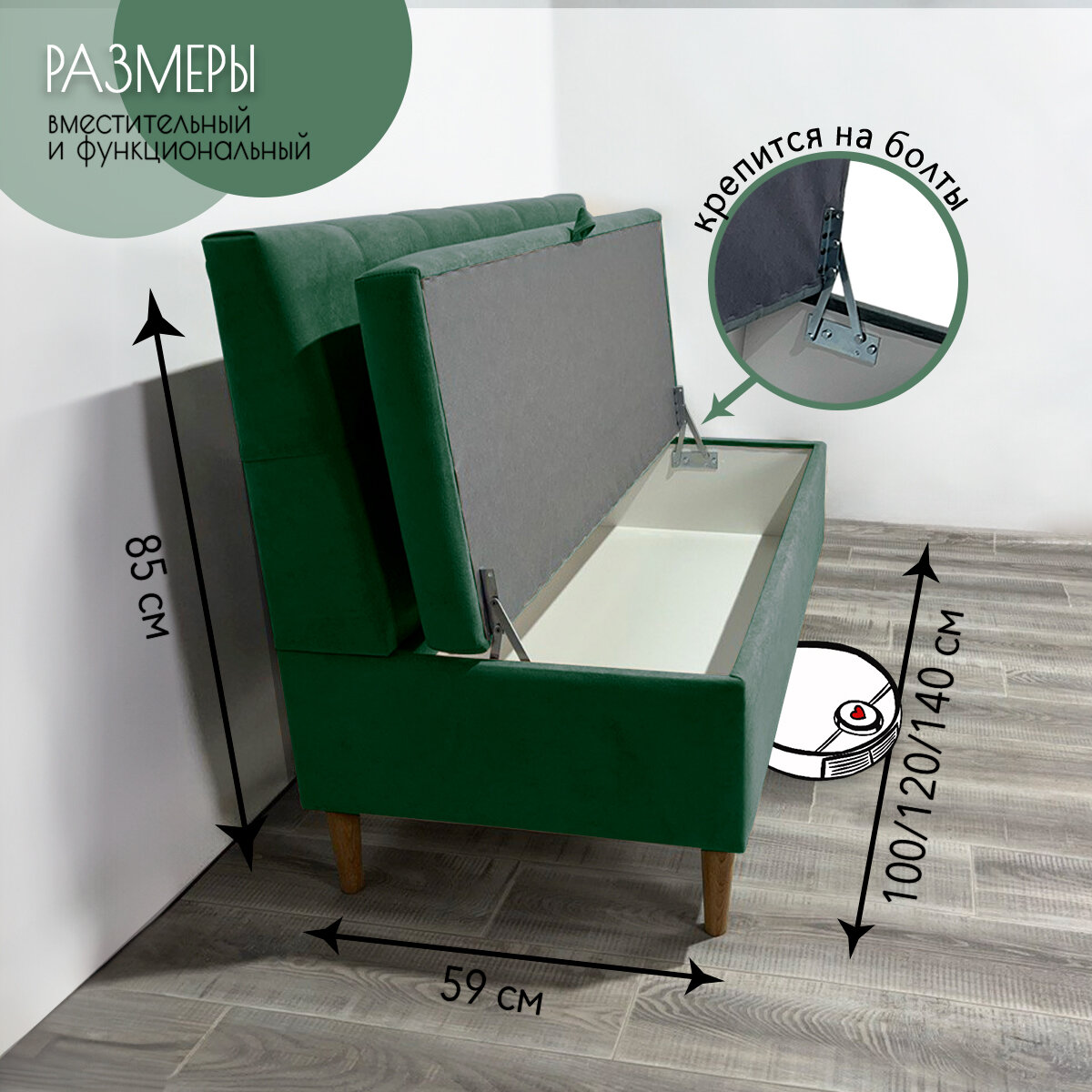 Диван на кухню "Рико" с ящиком для хранения/Велюр/Зеленый 120x59x85 интересное: