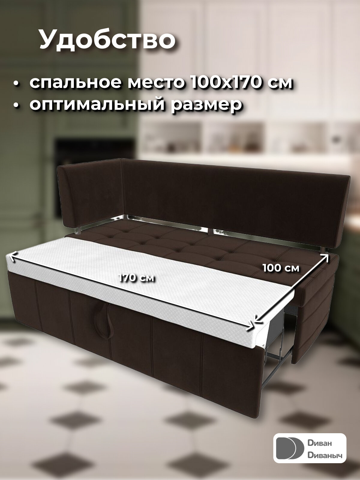 Диван кухонный прямой Лотос со спальным местом 100х170 см, угол справа, Велюр коричневый