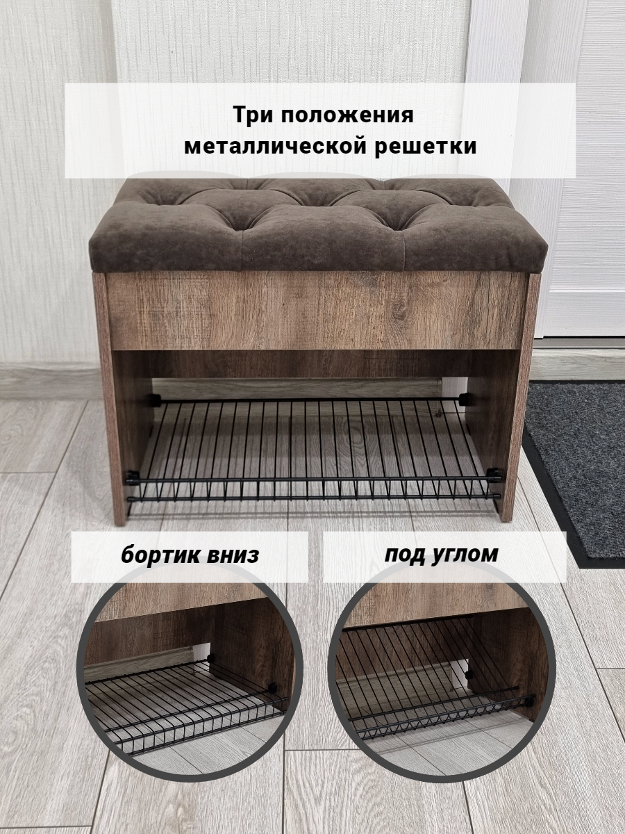 Пуфик в прихожую с обувницей и ящиком для хранения вещей Puffsib А-61, дуб вотан/коричневый велюр