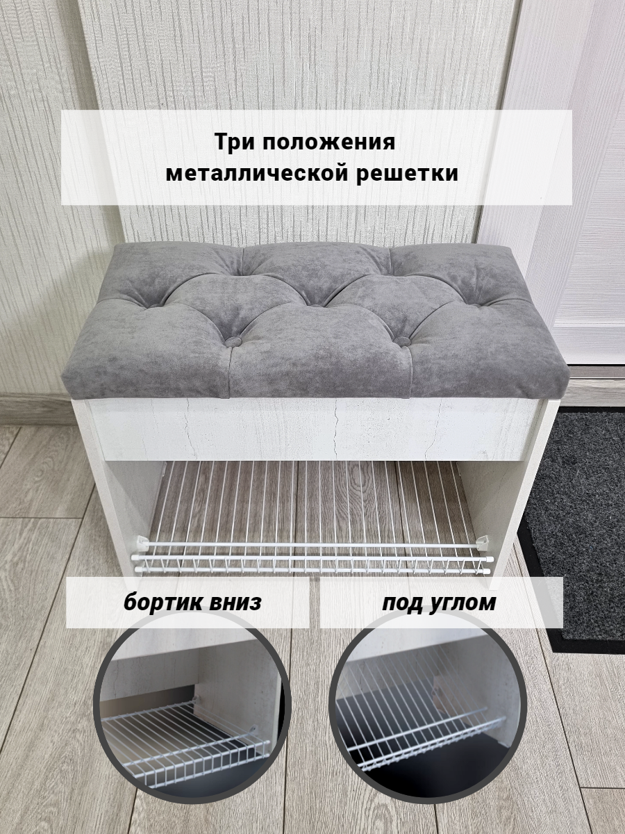 Пуфик в прихожую с обувницей и ящиком для хранения вещей Puffsib А-61, белый/серый
