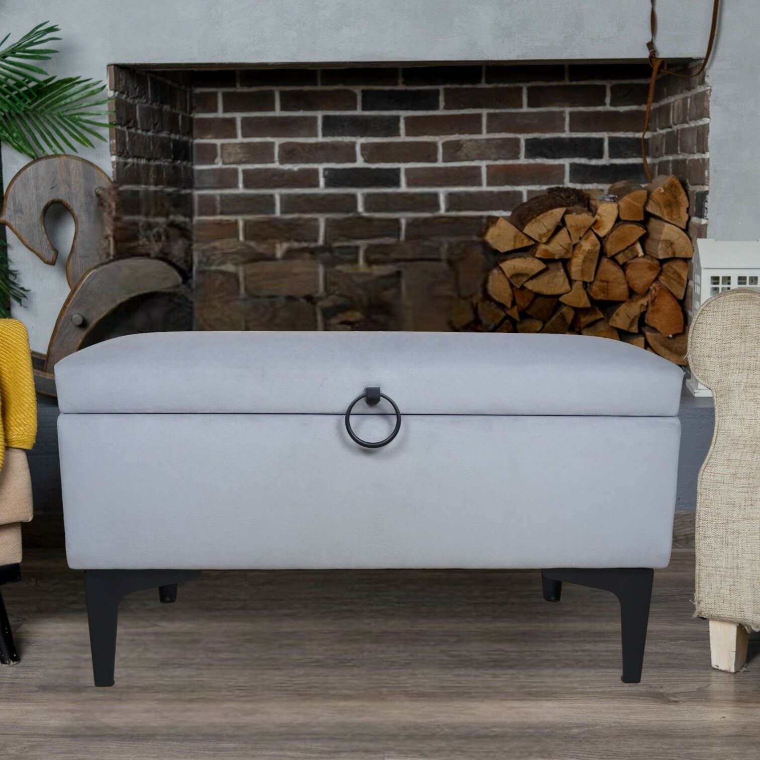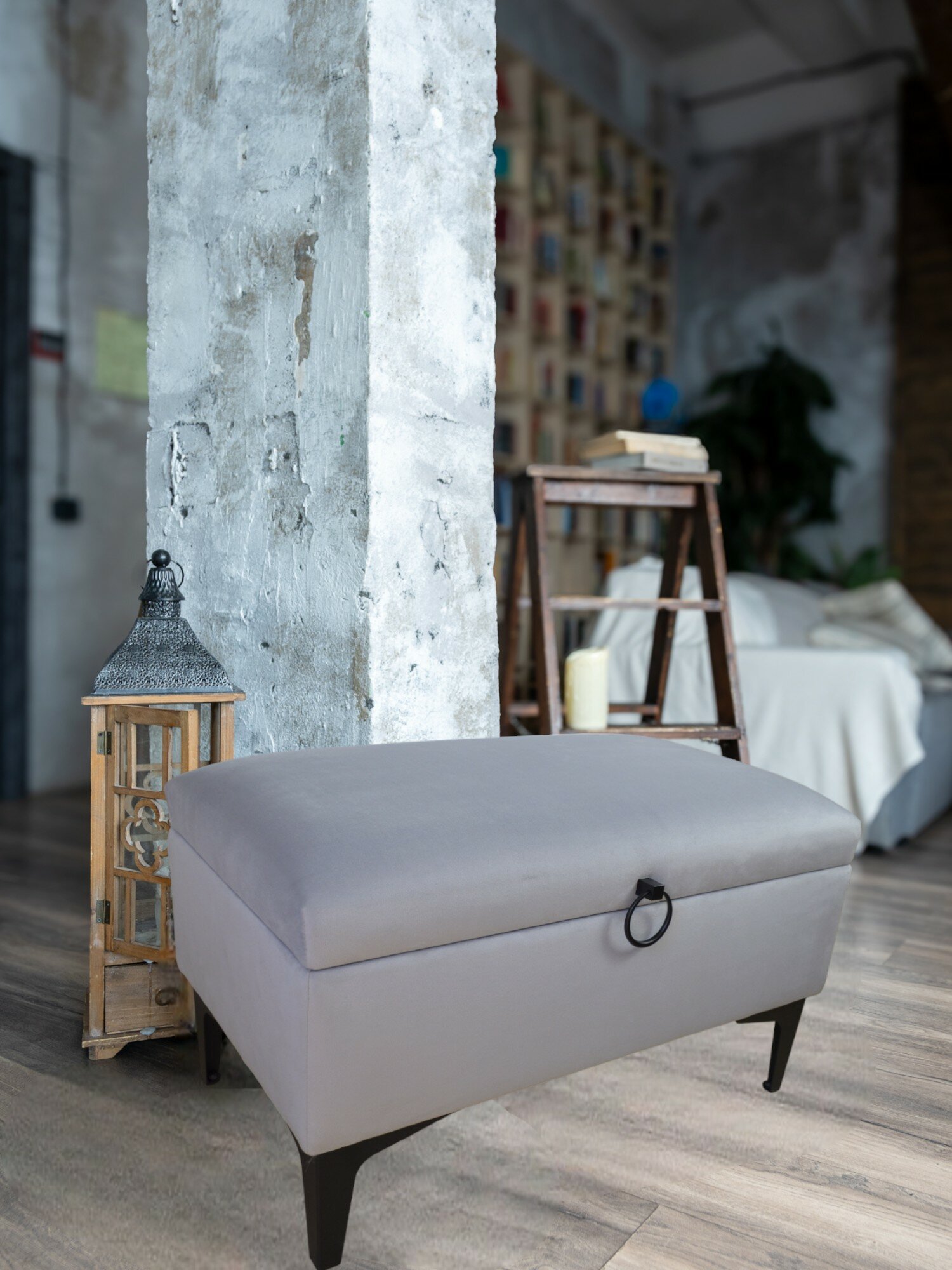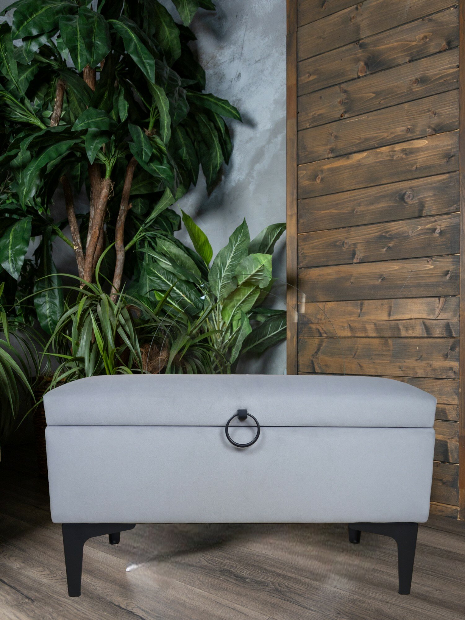 Банкетка серая однотонная из велюра на металлических ножках c ящиком для хранения пуфик в спальню и прихожую интересное: