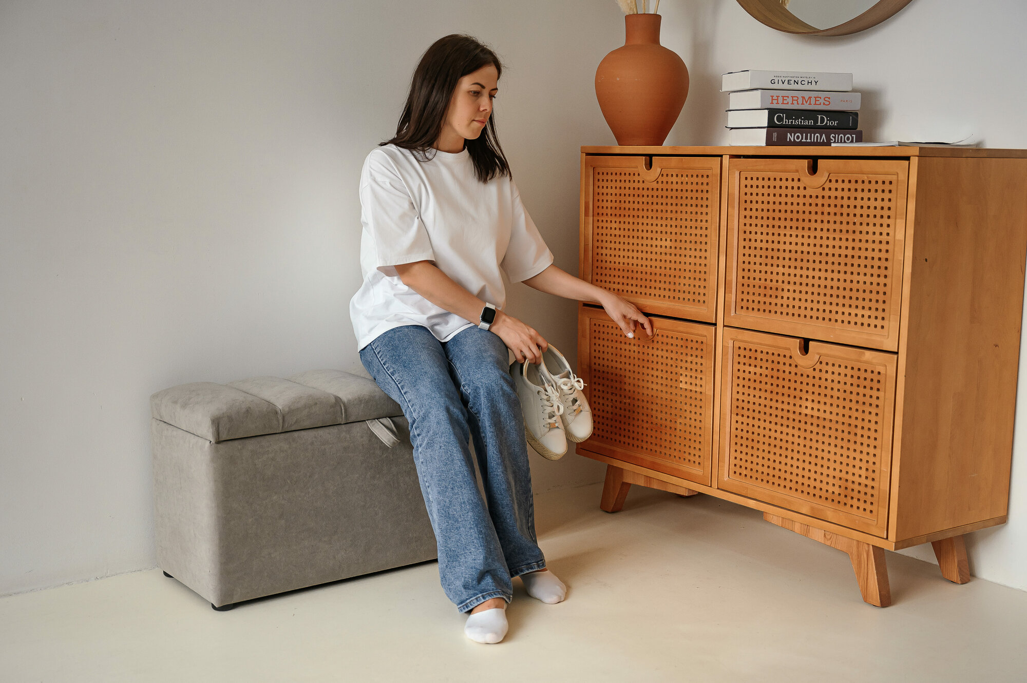Обувница для прихожей с сиденьем закрытая / Пуф мягкий из экокожи / Банкетка в прихожую Бежевый 59.5*38.5*38