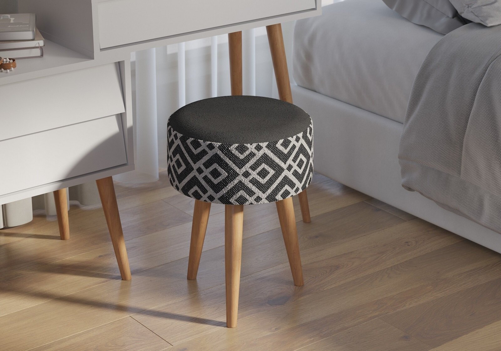 Круглая банкетка на трёх ножках Гранд Кволити Юна 6-5132, обивка ткань серая с рисунком, 33х33х45 см.