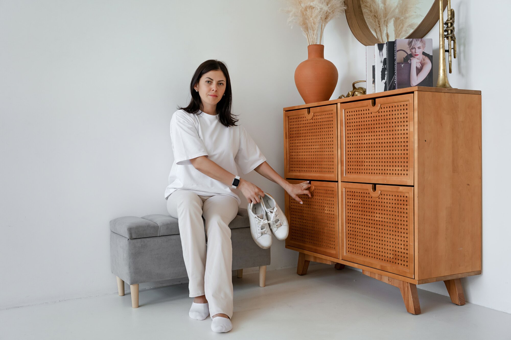 Обувница для прихожей с сиденьем закрытая / Пуф мягкий из экокожи / Банкетка в прихожую Бежевый 59.5*38.5*38