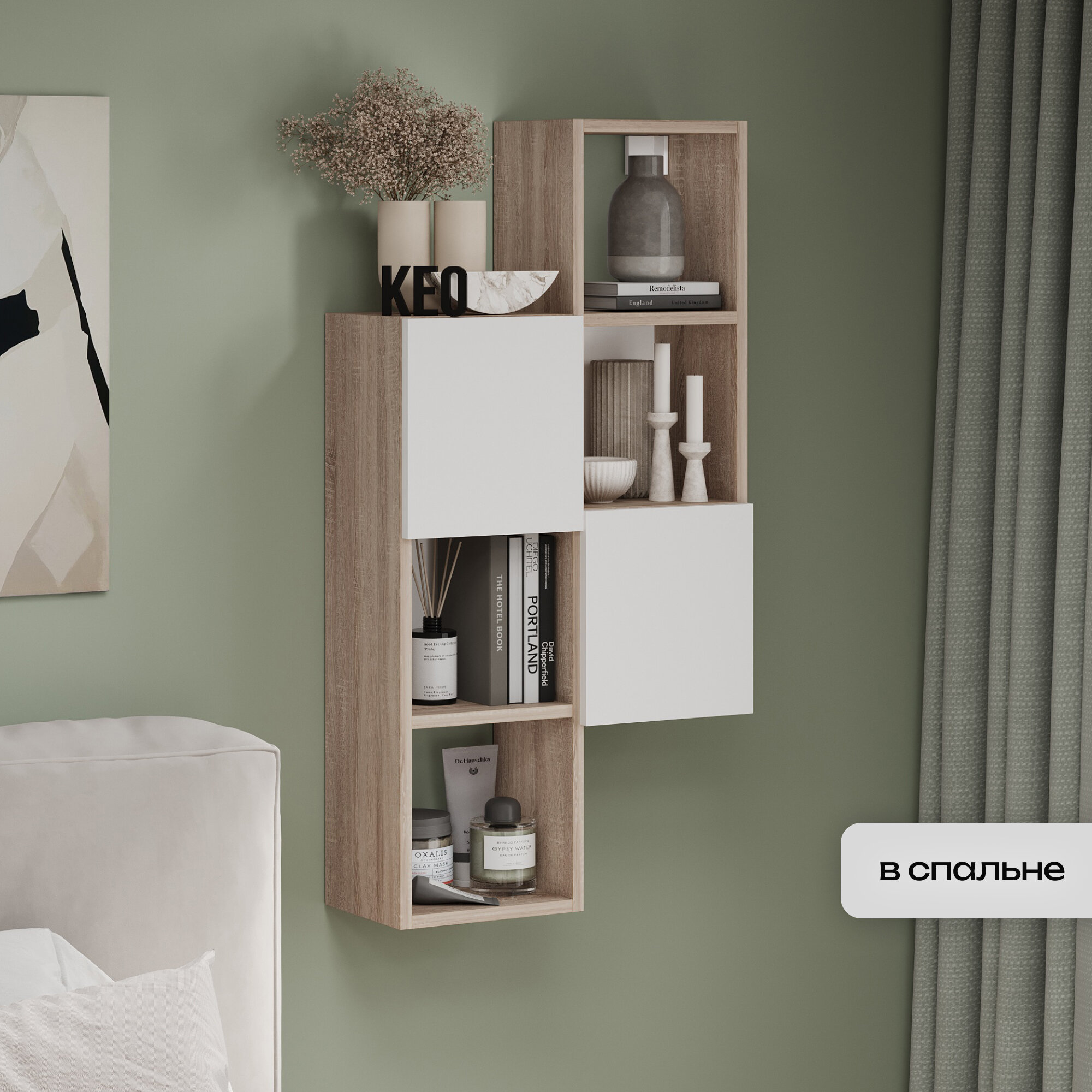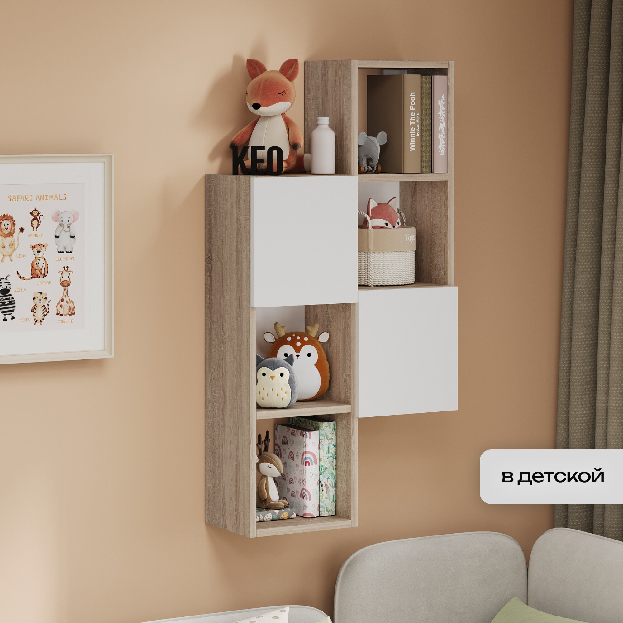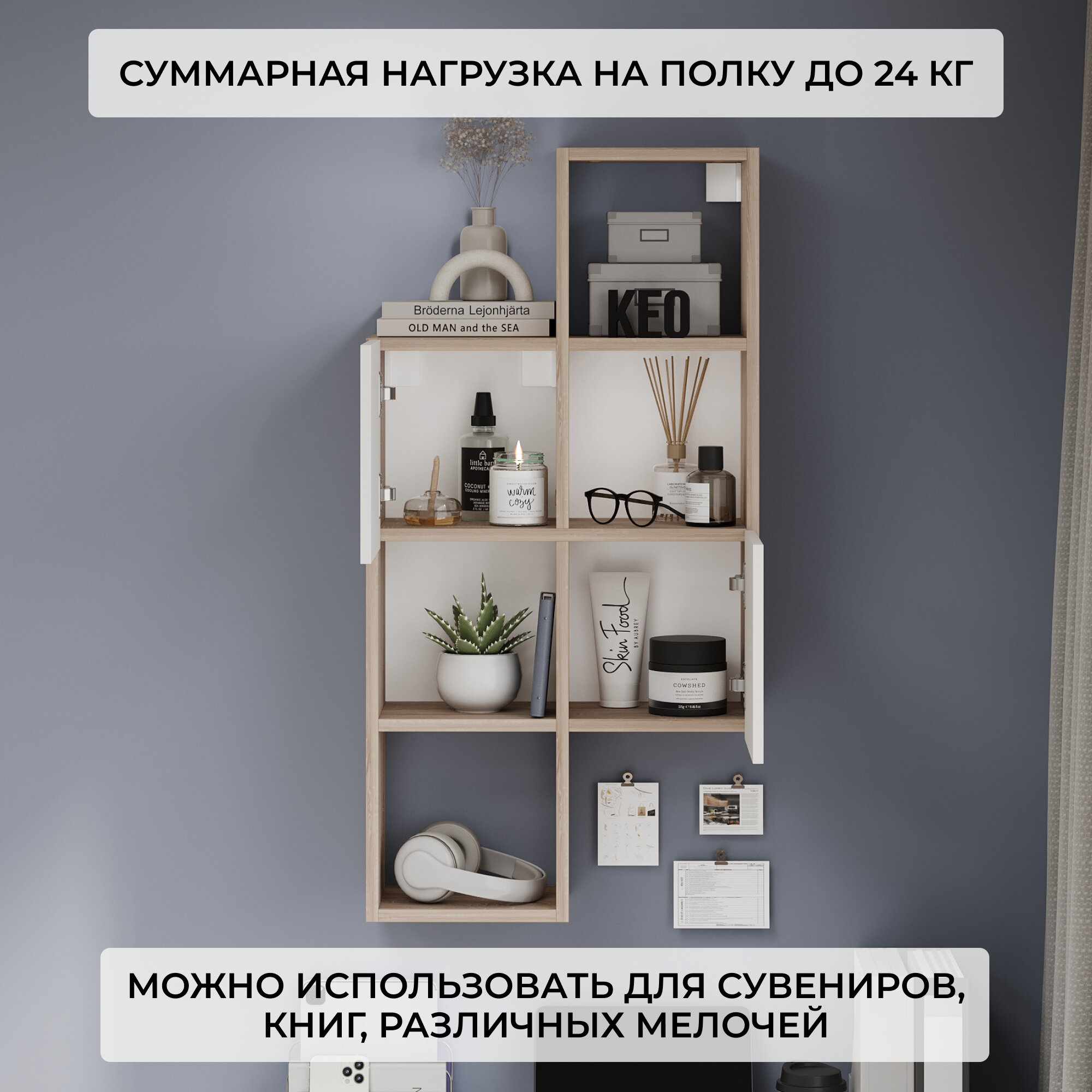 Полка настенная 72х21.9х95см модульная с дверцами для спальни детской ванной прихожей Кео ДИВ-ПЛК-427 белый