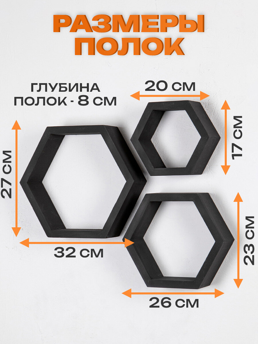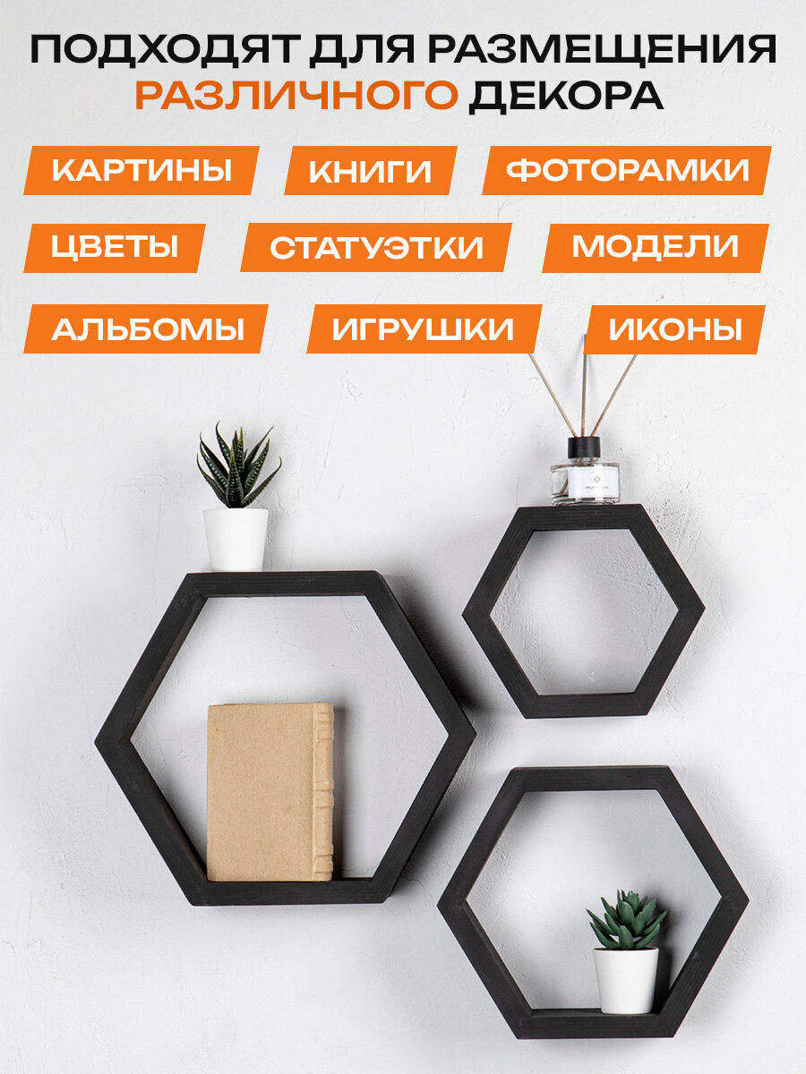 Купить Полки соты деревянные черные, настенные навесные для декора "Абелия"