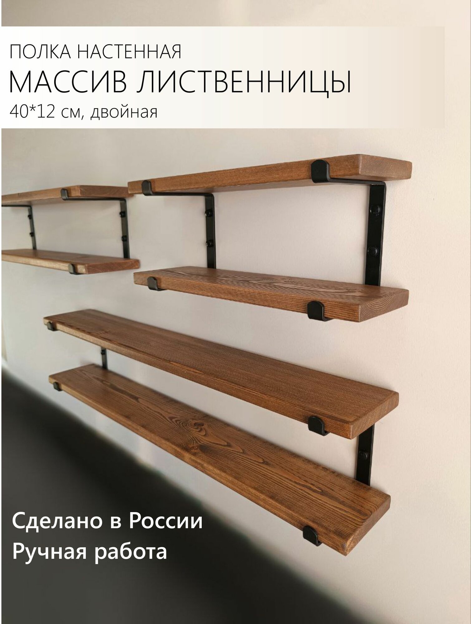Купить Полка настенная деревянная прямая из массива дерева лиственницы двойная для кухни, ванной, прихожей, гостиной, 12*40*17 см
