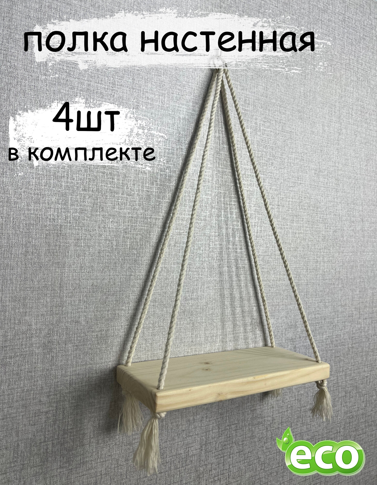 Купить Полка настенная прямая из дерева на веревках подвесная светлая 24х10х38 см, комплект 4 шт.