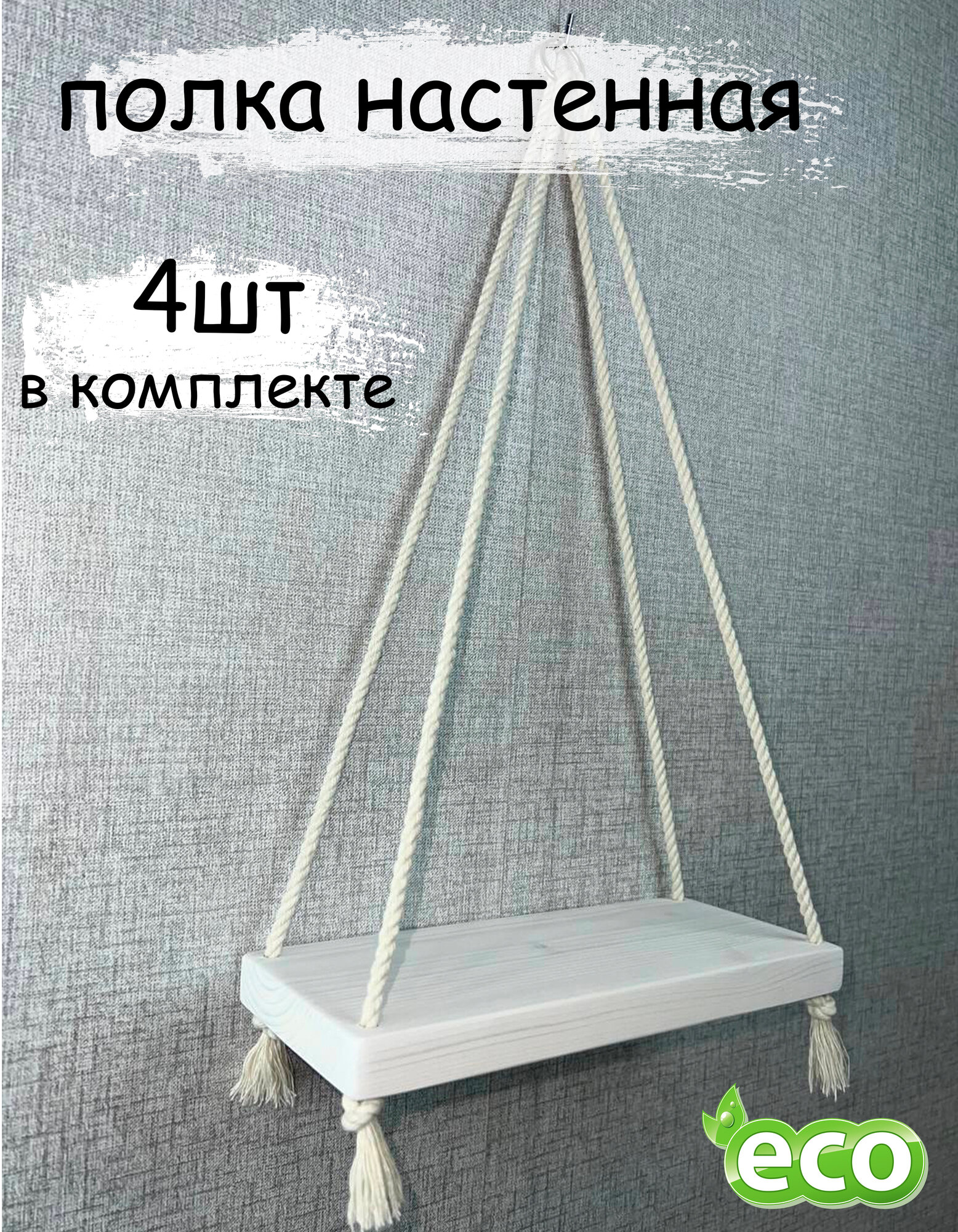 Купить Полка настенная прямая из дерева на веревках подвесная белая 24х10х38 см, комплект 4 шт.