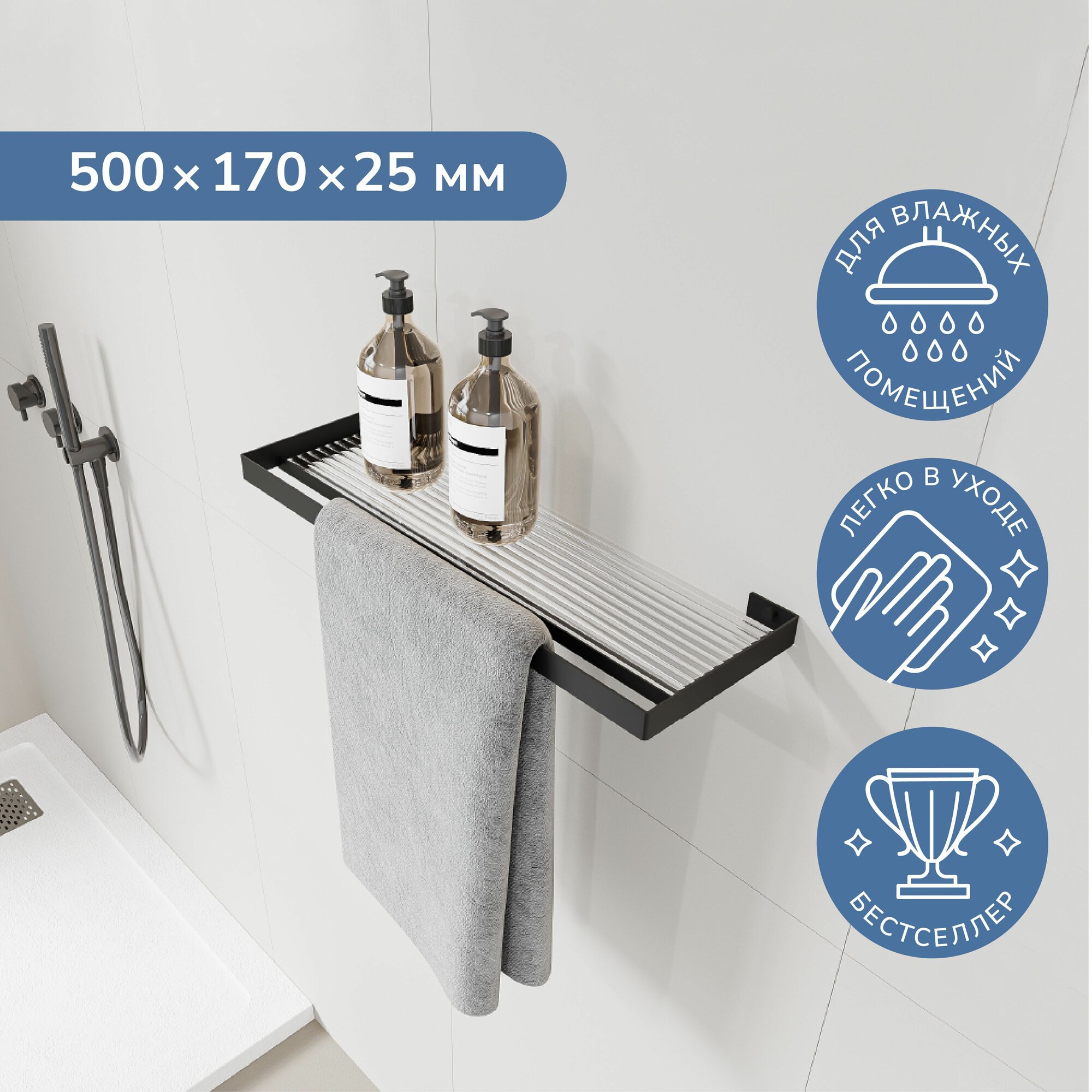 Полка с полотенцедержателем Ulitka Unit, универсальная, 60х8х10см, металл, цвет черный