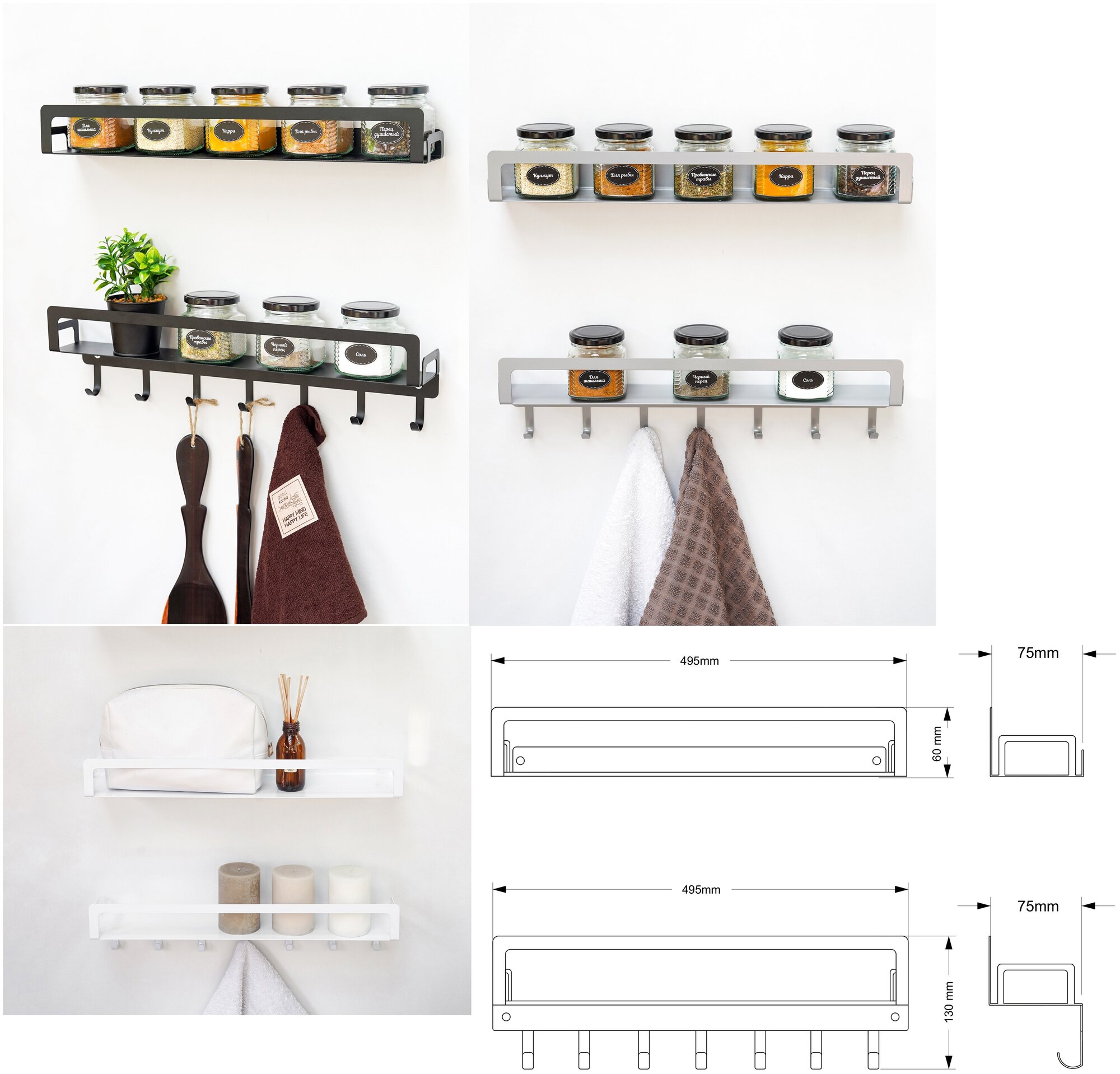 Полка для кухни металлическая ElectricLight 49,5х7,5. 2 полки с крючками. Белая.