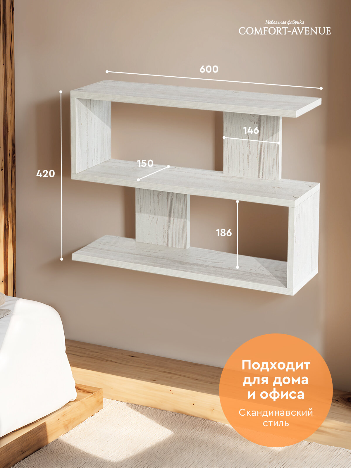 Полка Comfort-Avenue "Скандинавия", ЛДСП, настенная, 42х60х15 см, белая