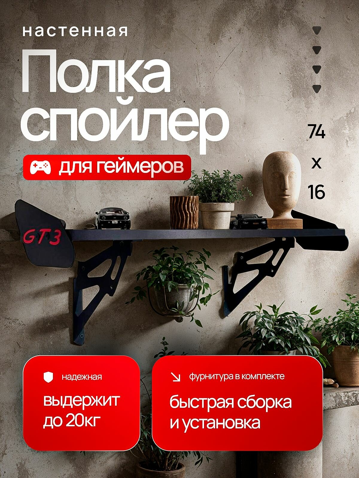 Полка-спойлер GT3, ЛДСП, настенный монтаж, черная, 74х16х1.6 см интересное: