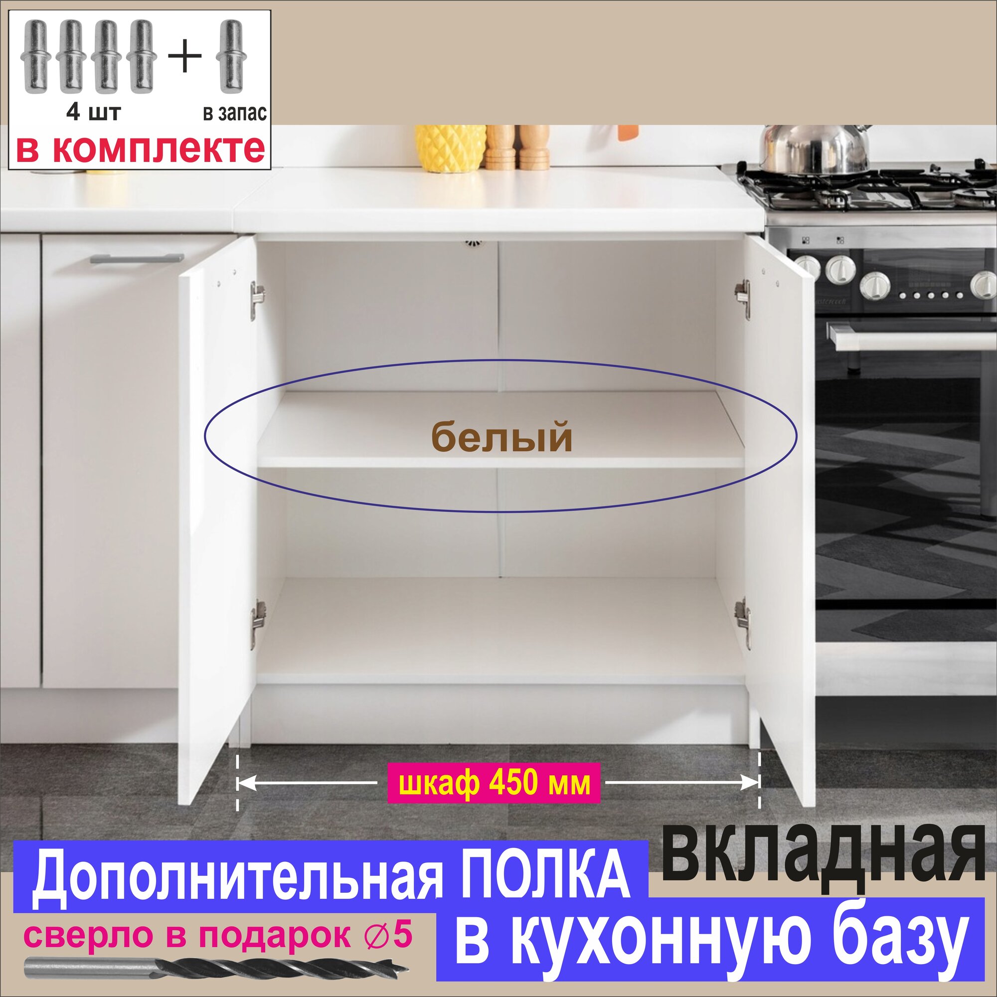 СохранитьПолка Дополнительная в Кухонную Базу 450мм, Вкладная 414 х 440 х 16 мм; Цвет: W1000 Белый Премиум, 1шт. интересное:
