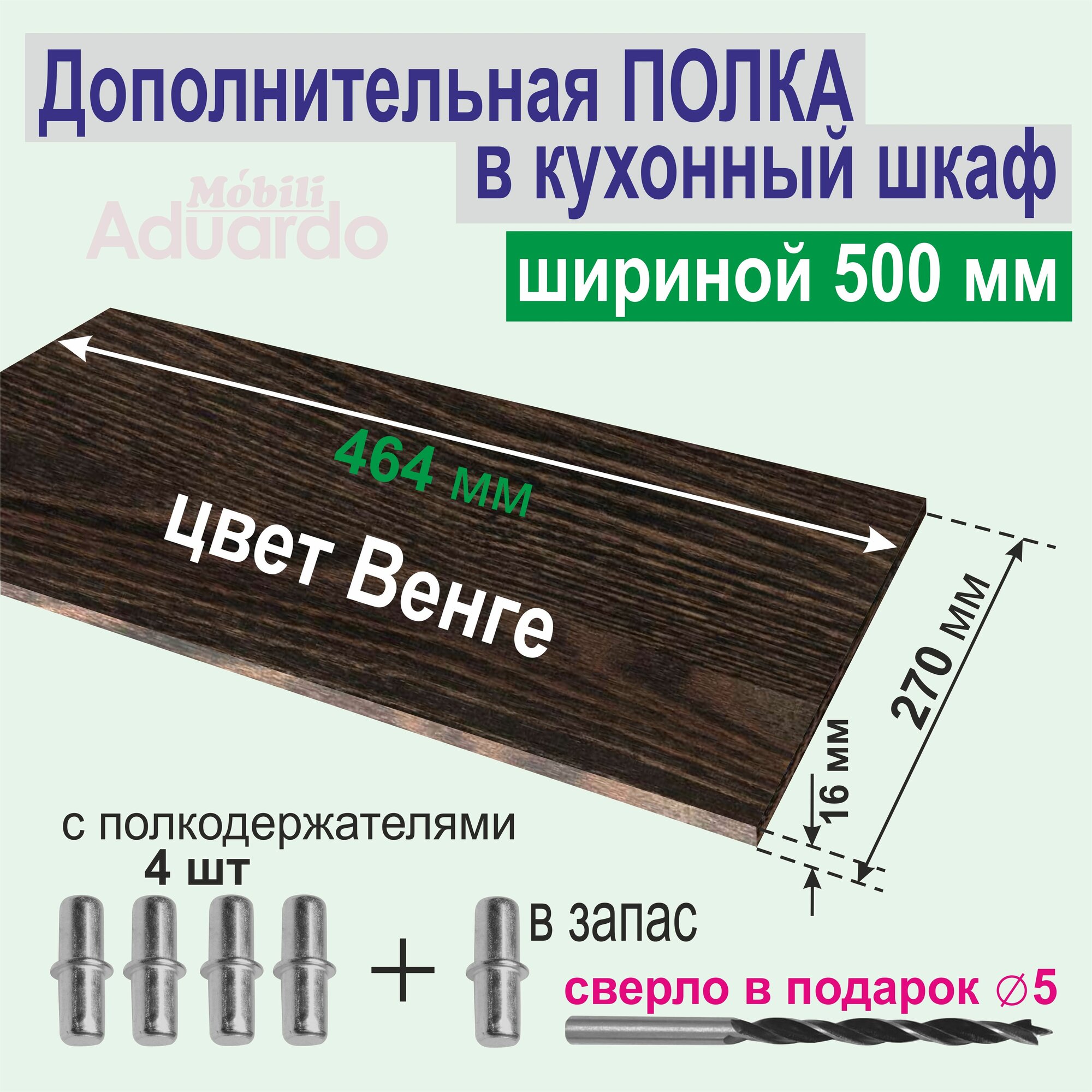СохранитьПолка Дополнительная в Кухонный, Верхний шкаф 500 мм, на Кухню, Вкладная 464 х 270 х 16 мм; Цвет: ВЕНГЕ, 1 шт. интересное: