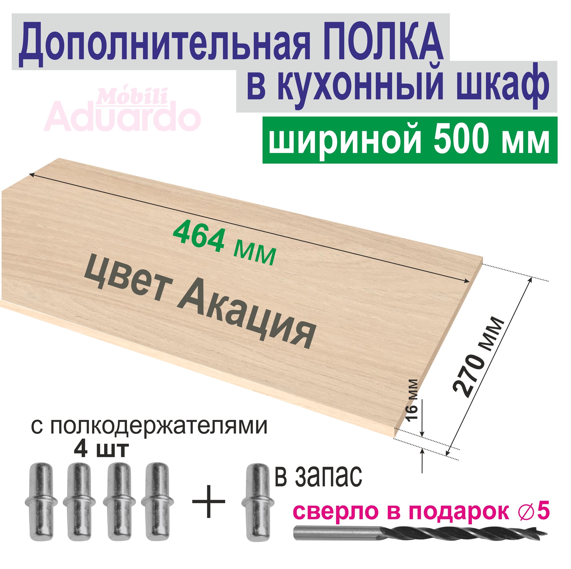 СохранитьПолка Дополнительная в Кухонный, Верхний шкаф 500мм, Вкладная 464 х 270 х 16мм; 1шт. Цвет: H1277 Акация Лэйклэнд Светлая интересное: