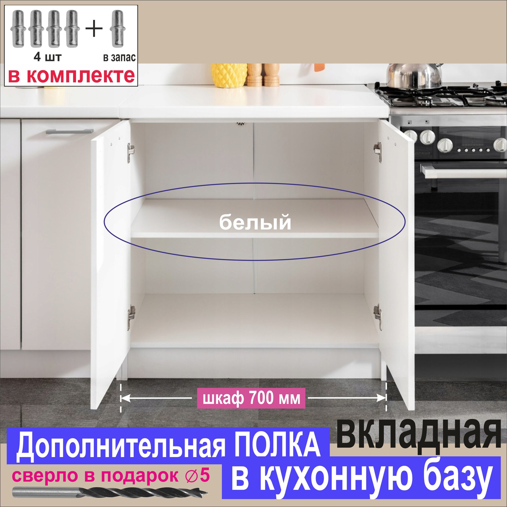 Полка Дополнительная в Кухонный, Верхний шкаф 600мм, Вкладная 564 х 270 х 16 мм Цвет: Бежевый или Ванильный, 1шт