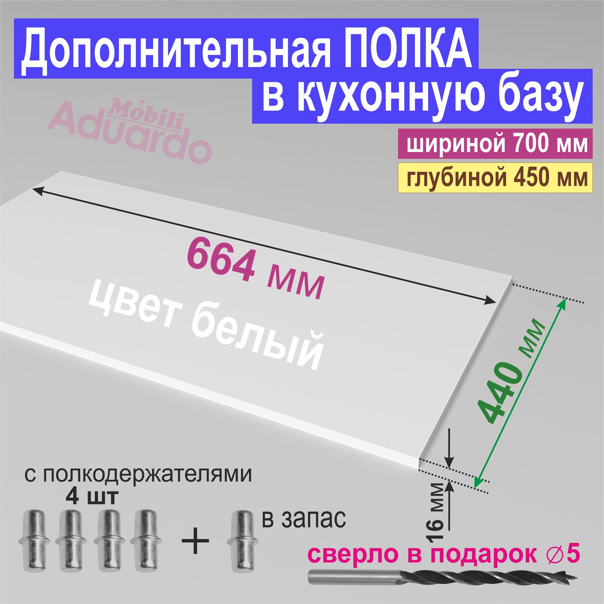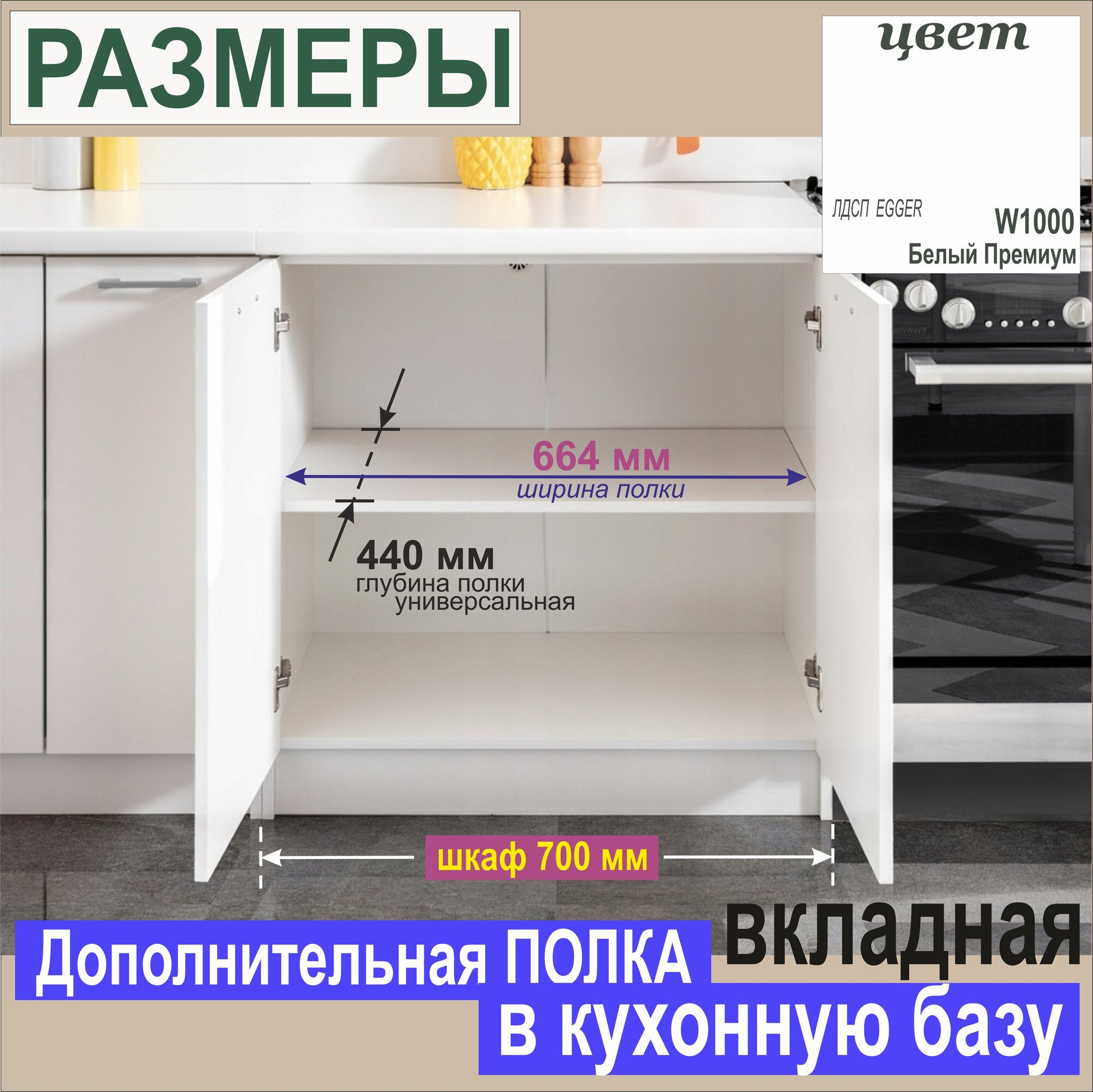 Полка Дополнительная (Комплектом 2 шт – 6 %) в Кухонную Базу 700мм (664 х 440 х 16 мм) Цвет: W1000 Белый Премиум, 2 шт.