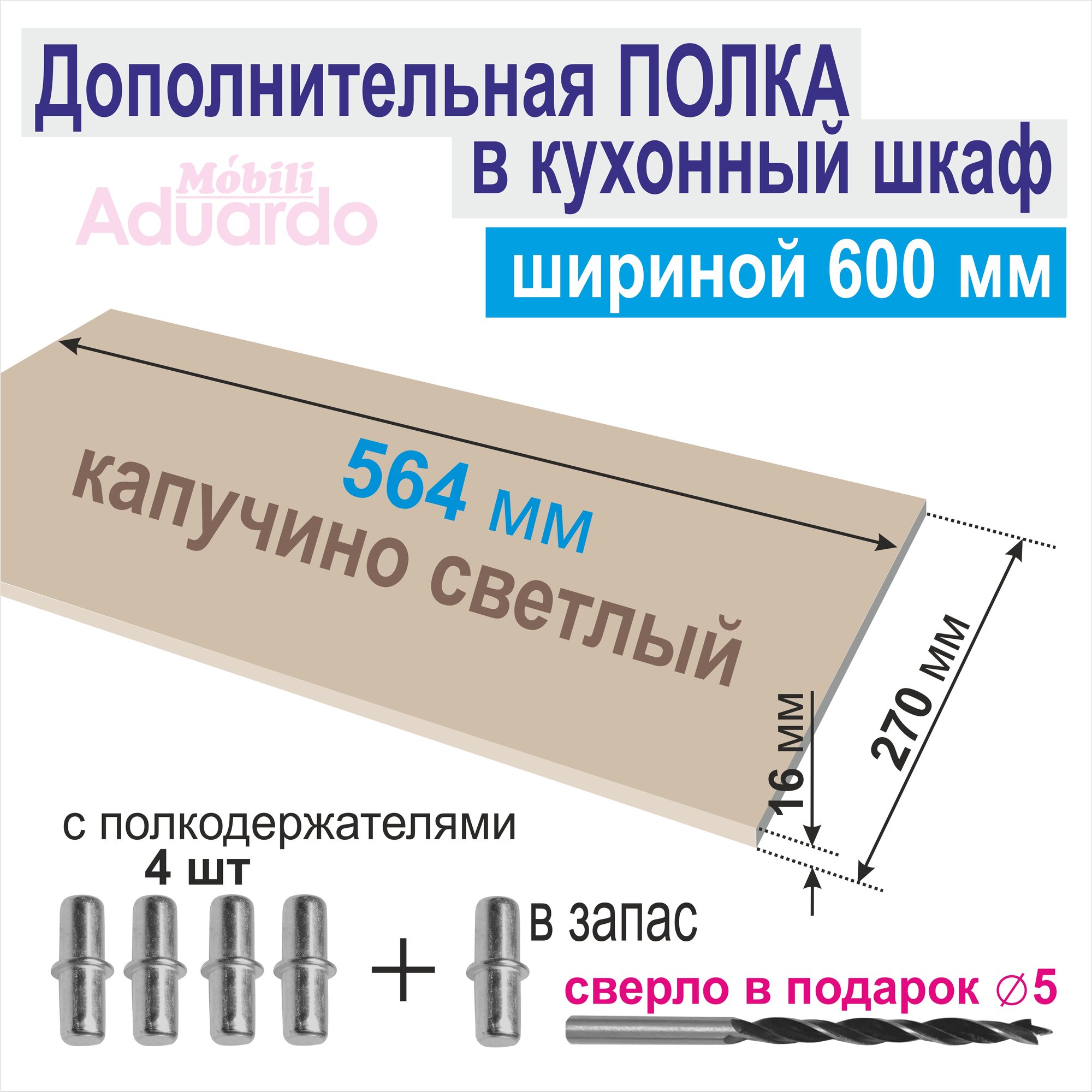 Полка Дополнительная (Комплект 2 шт) в Кухонный, Верхний шкаф 600мм, 564 х 270 х 16 мм; Цвет: Капучино Светлый, 2 шт.
