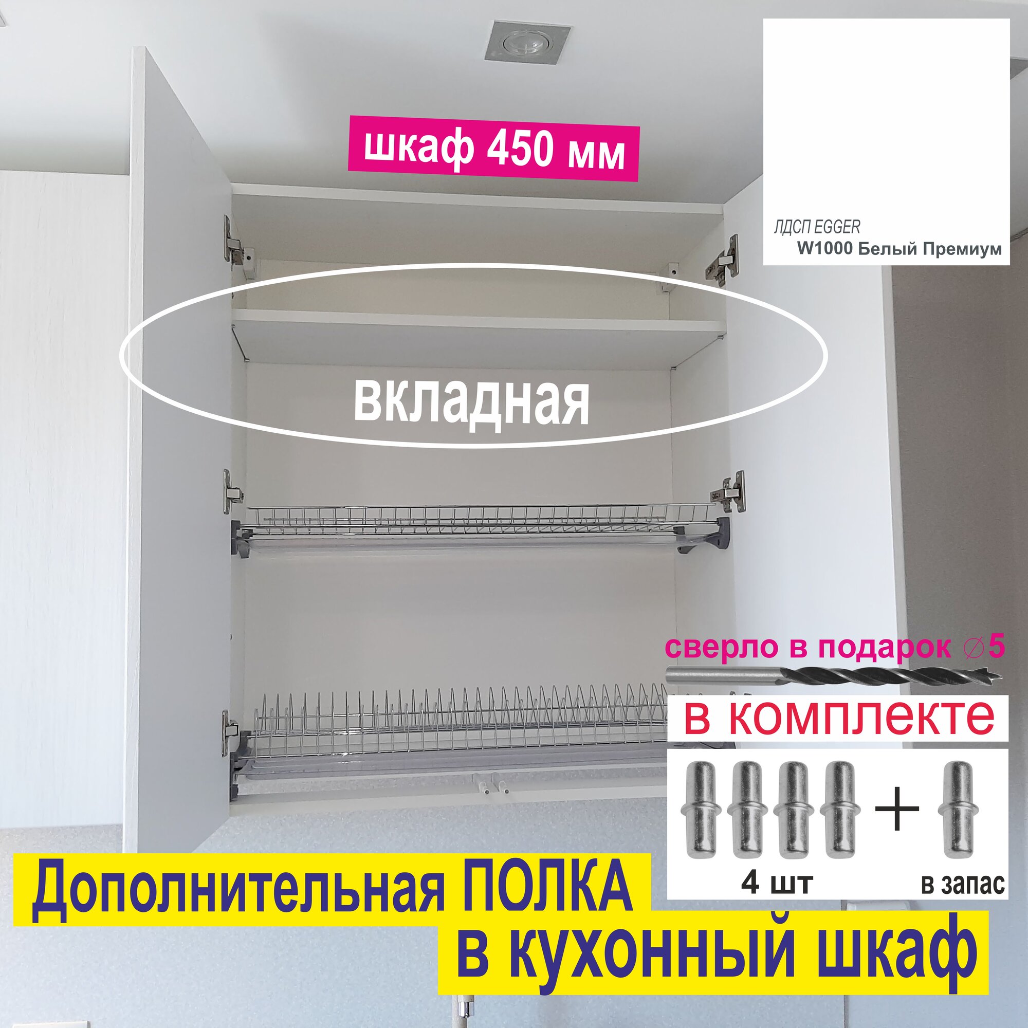 СохранитьПолка Дополнительная в Кухонный, Верхний шкаф 450мм (Комплект 3 шт) Вкладная 414 х 270 х 16мм; Цвет W1000 Белый Премиум интересное: