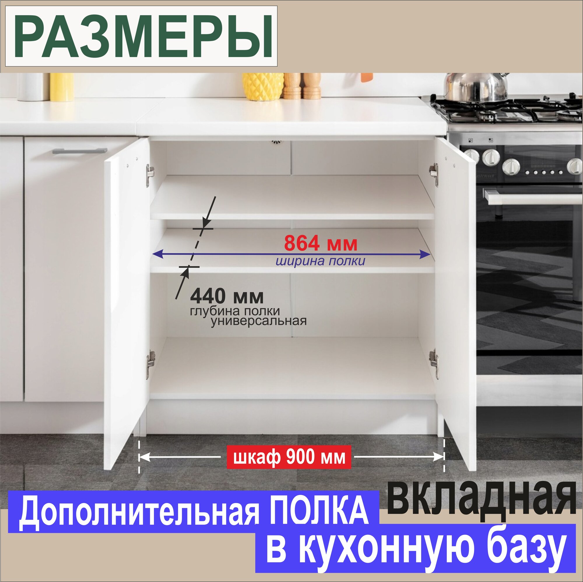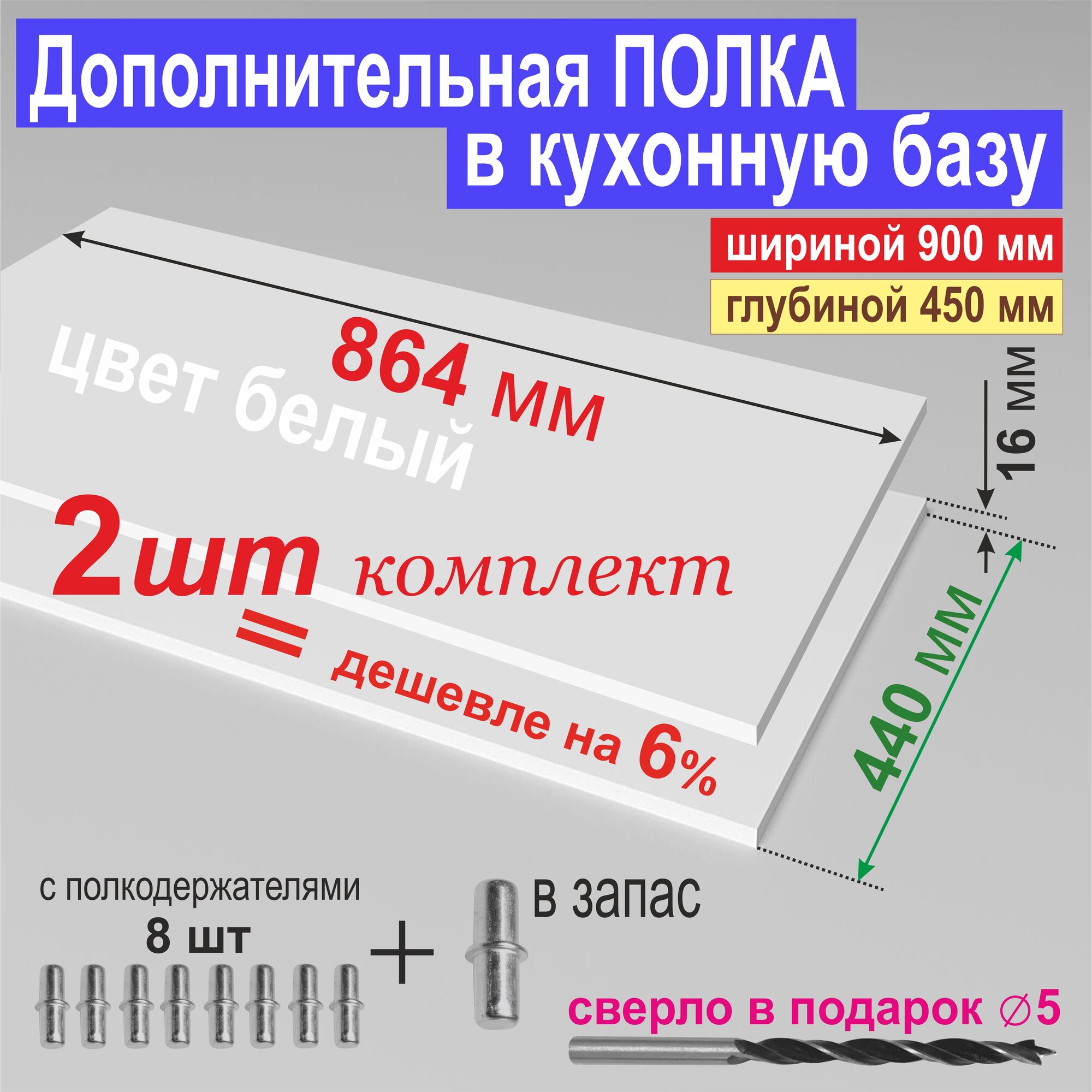 СохранитьПолка Дополнительная (Комплектом 2 шт – 6 %) в Кухонную Базу 900мм (864 х 440 х 16 мм) Цвет: W1000 Белый Премиум, 2 шт. интересное: