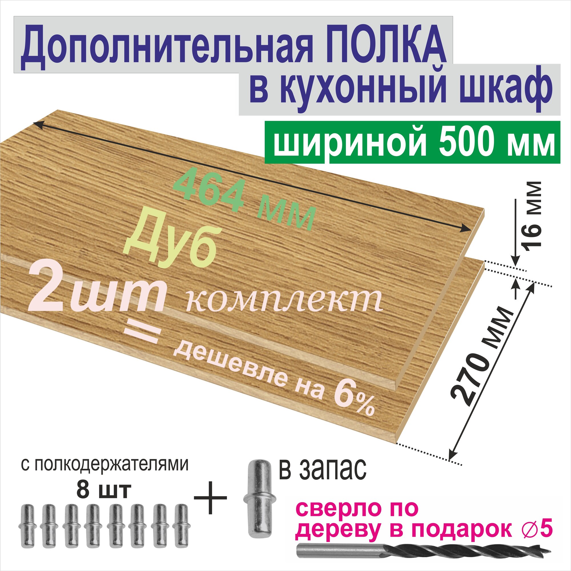СохранитьПолка Дополнительная в Кухонный, Верхний шкаф 500мм (Комплект 2шт) Вкладная 464 х 270 х 16 мм; Цвет: H3395 Дуб Корбридж интересное:
