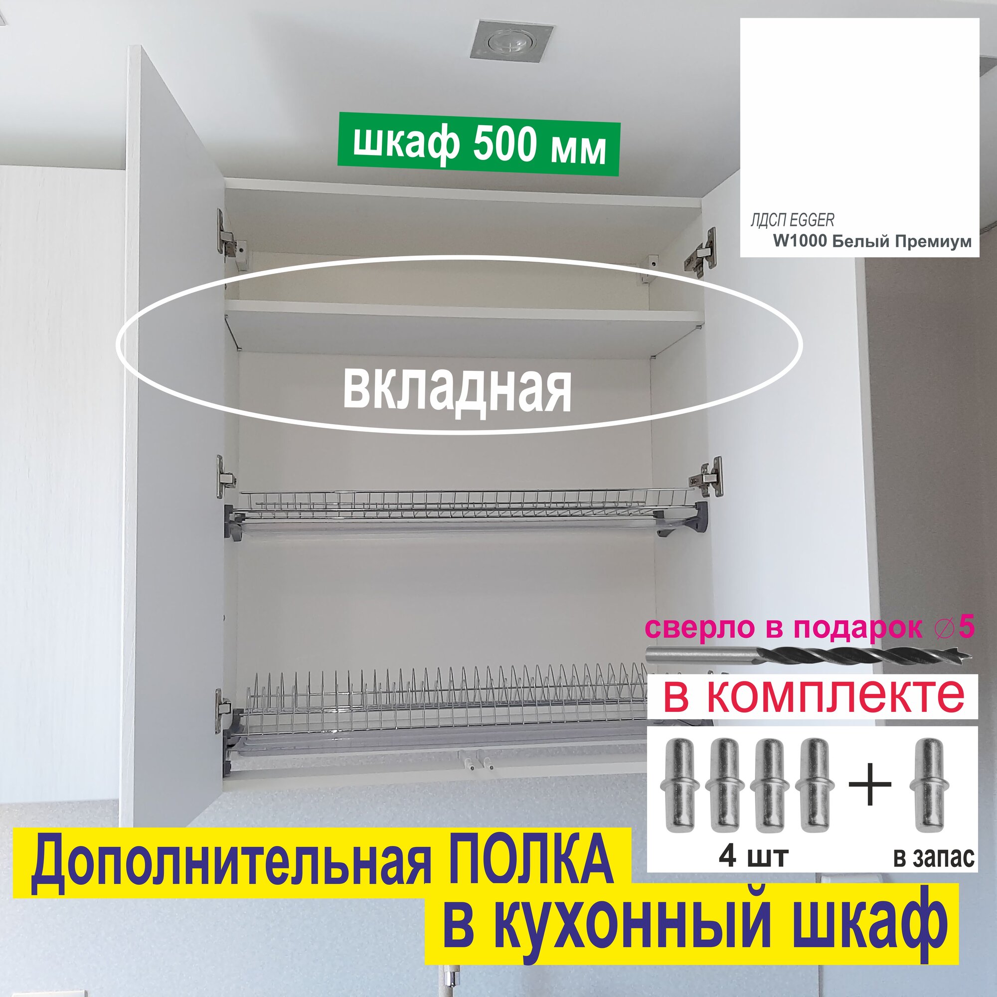 СохранитьПолка Дополнительная в Кухонный, Верхний шкаф 500мм (Комплект 3 шт) Вкладная 464 х 270 х 16мм; Цвет W1000 Белый Премиум интересное: