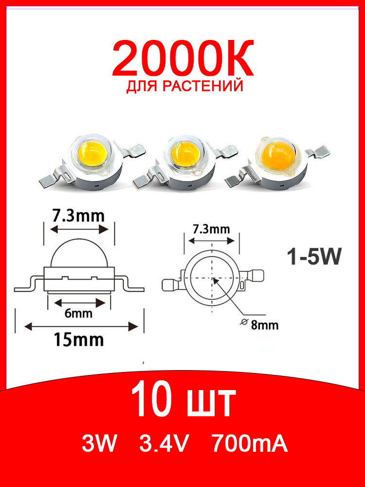 Светодиод мощный COB матрица светодиода 3.0-3.4 В, 3 Вт, 700 мА, 280 лм, RA 80, 8 мм, 20 штук (свет для растений 2000К)