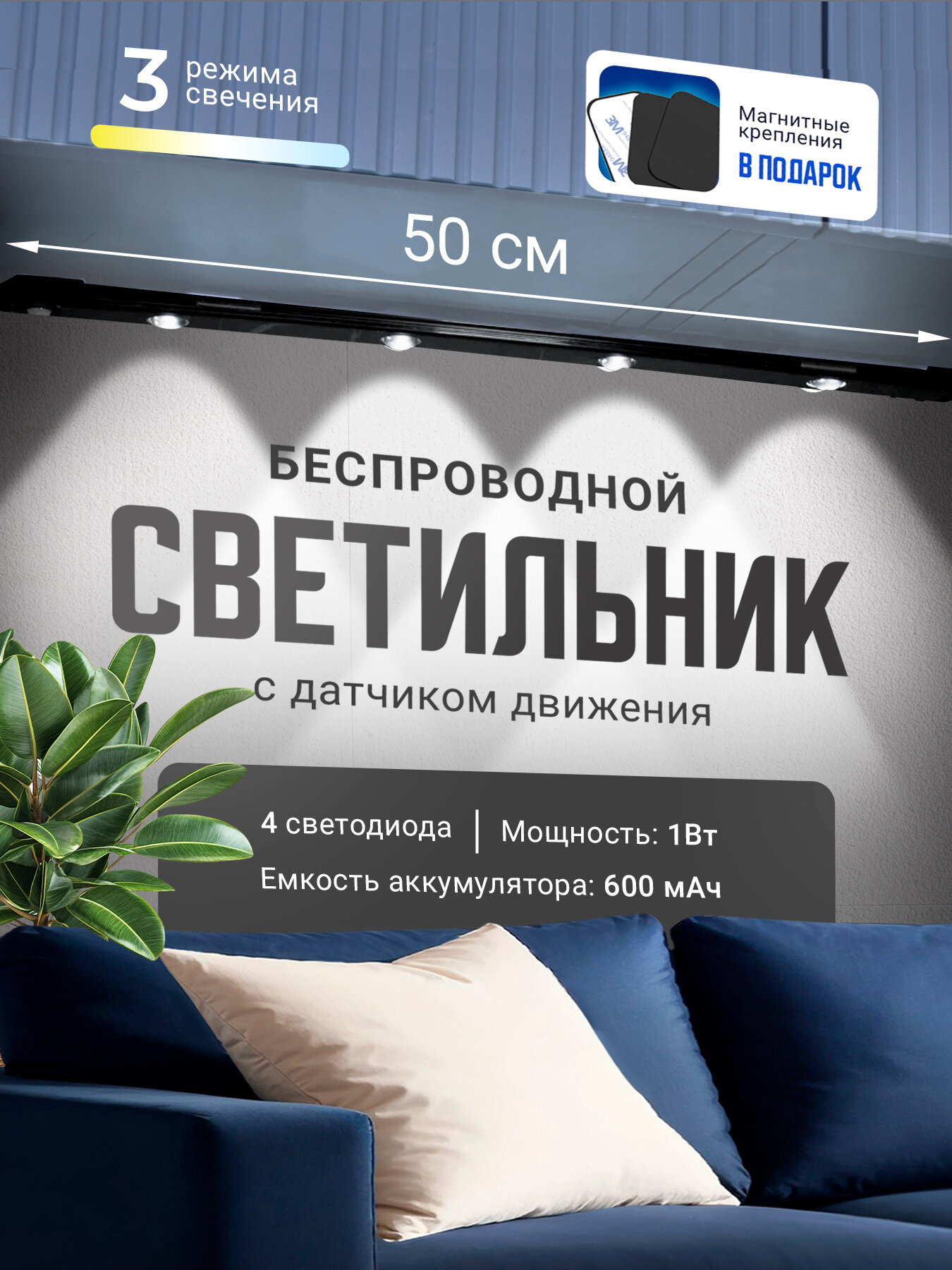 Ультратонкий беспроводной светильник 50 см с датчиком движения интересное: