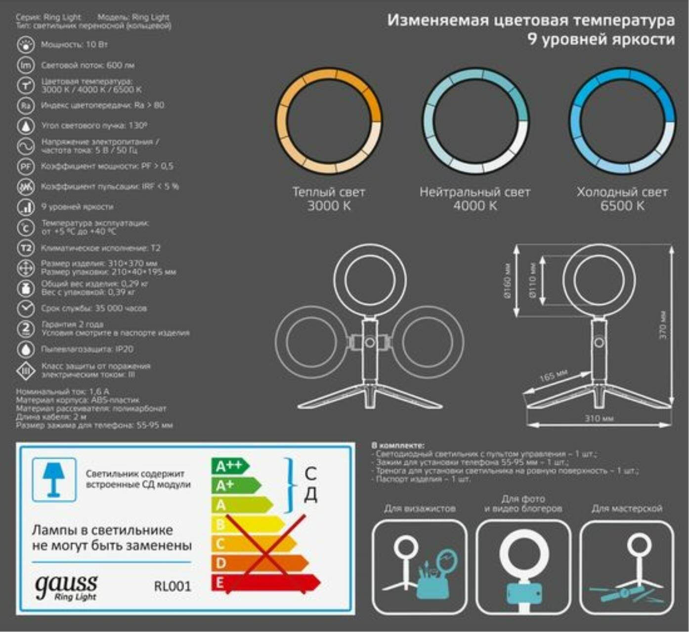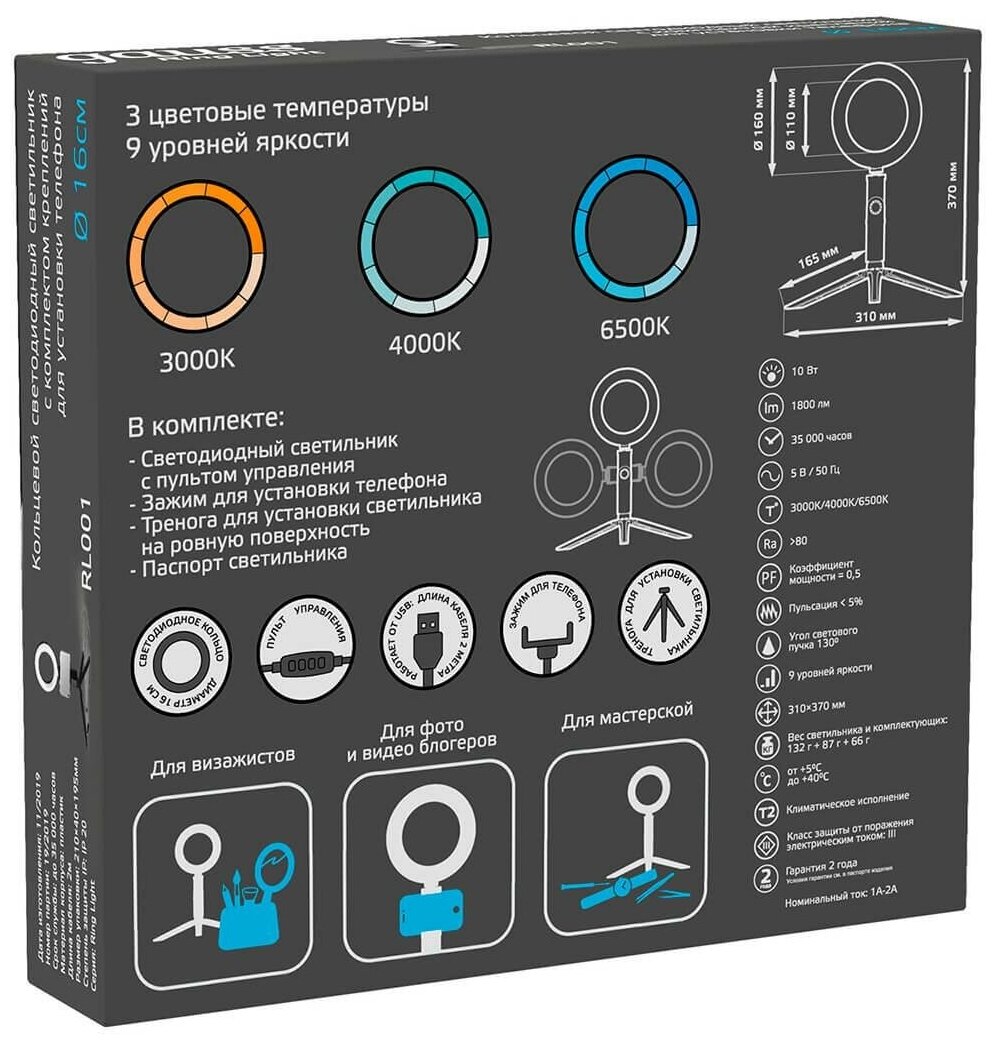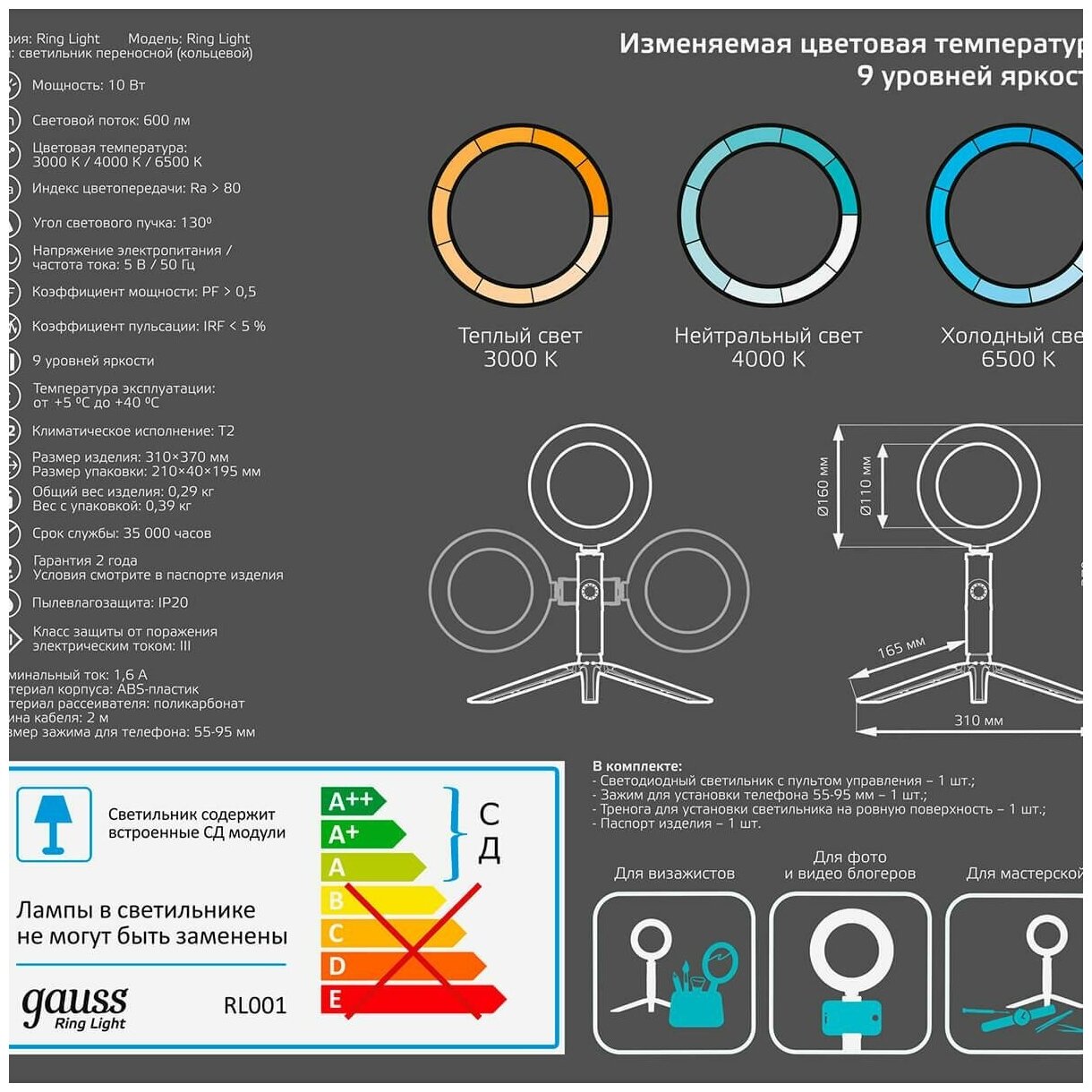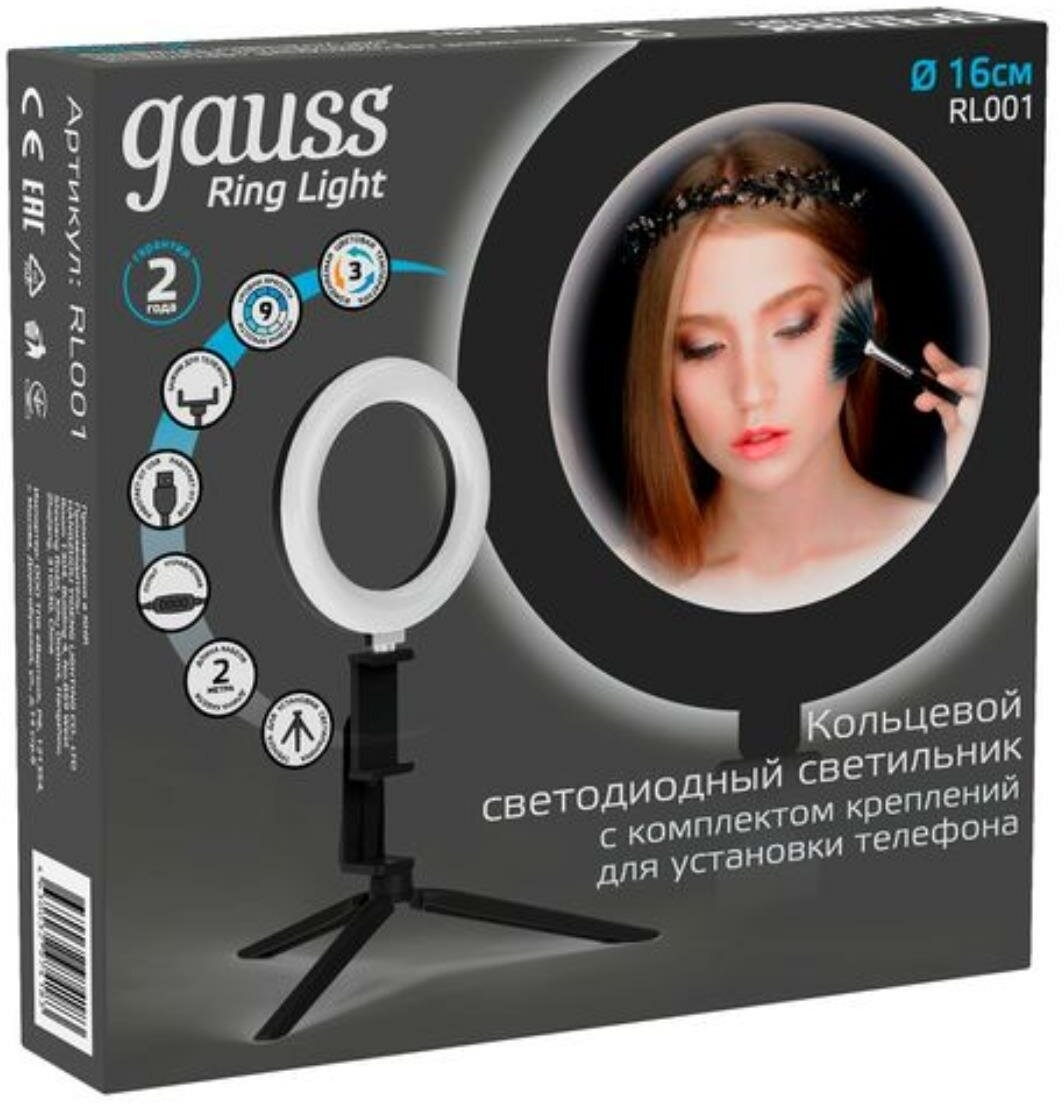 Светильник Gauss RL001 кольцевой 10W 600lm 3000-6500K 5V USB IP20 интересное: