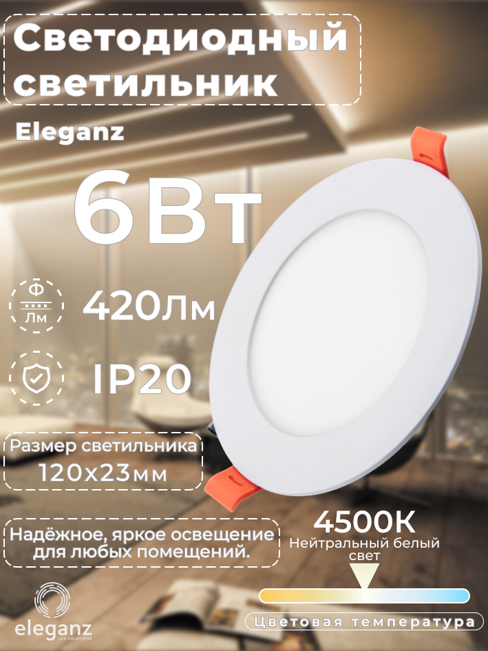 Купить Cветильник потолочный металлический "Eleganz" 6вт, 220в круглый 4500К, для натяжного и подвесного потолка, белый, 1 шт.
