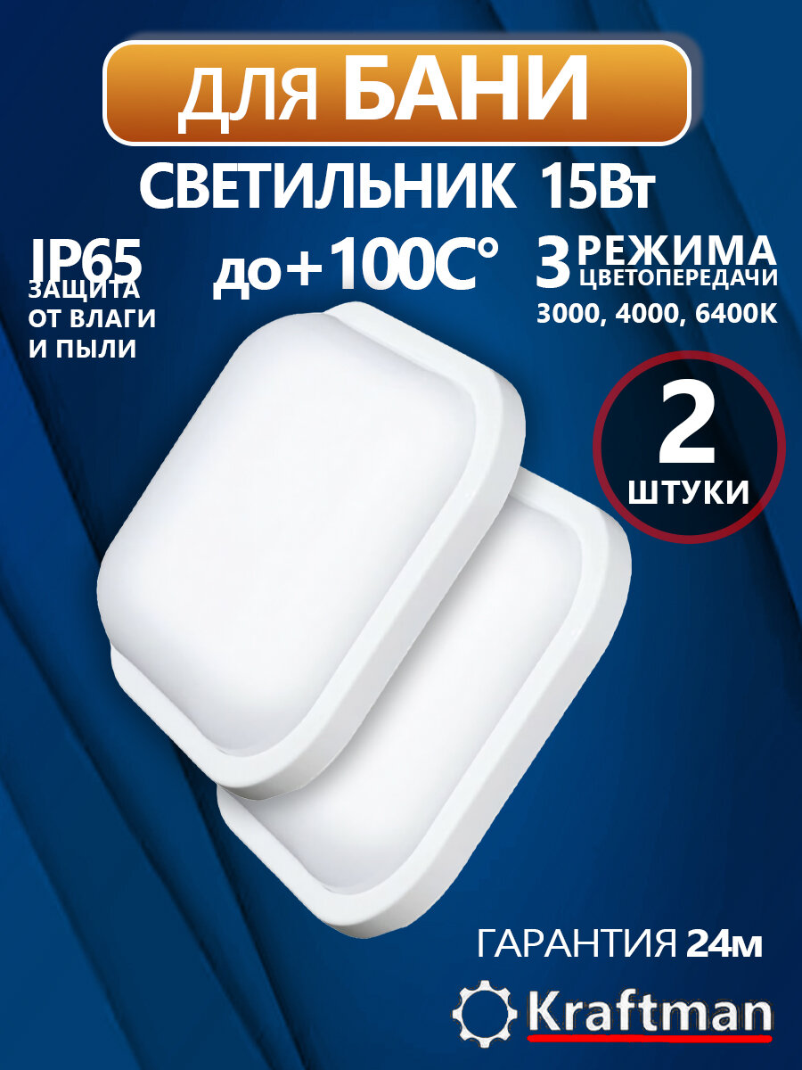 Светильник влагозащищенный, 15Вт, для бани, накладной, светодиодный, с переключателем цветовой температуры, IP65