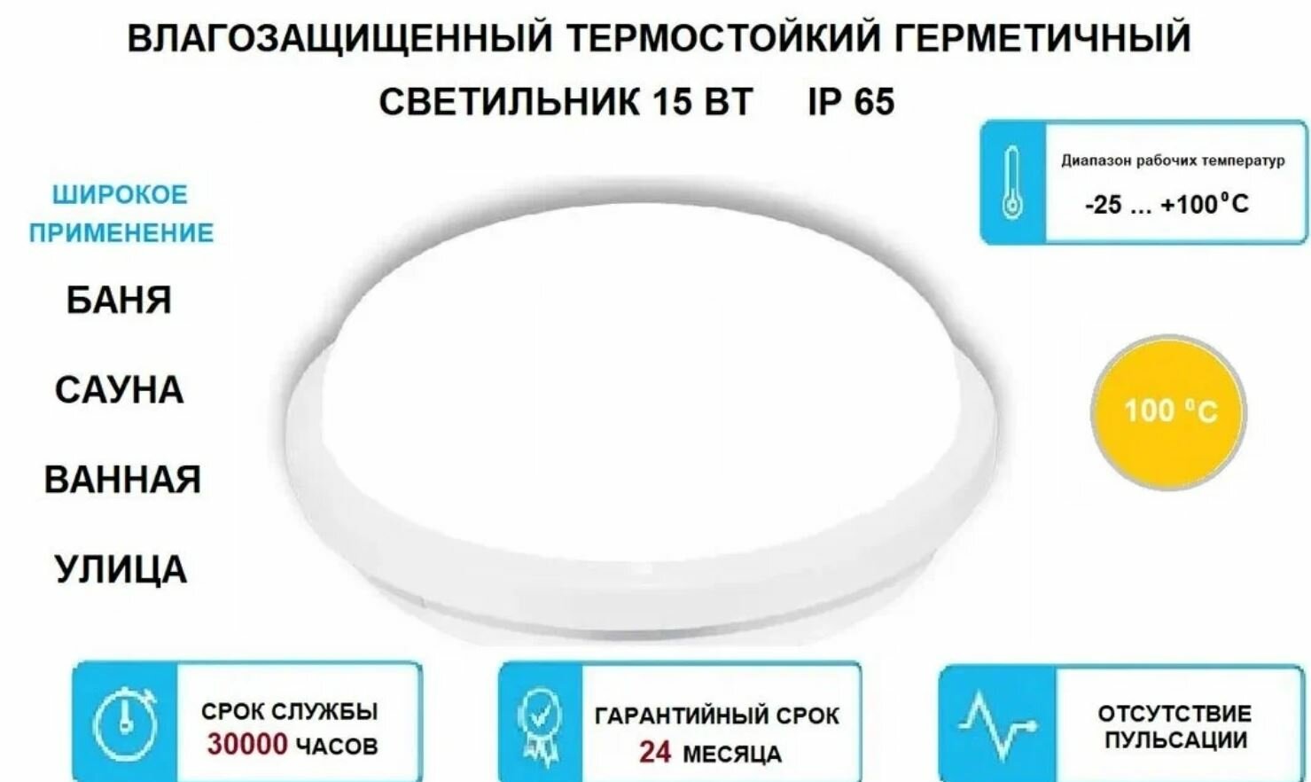 Светильник влагозащищенный, 15Вт, для бани, накладной, светодиодный, с переключателем цветовой температуры, IP65