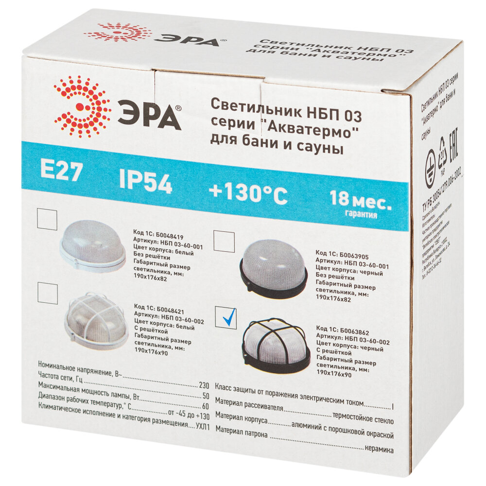 Светильник ЭРА "Акватермо" НБП 04-60-001, для бани, сауны и ванны, E27, 60W, IP54