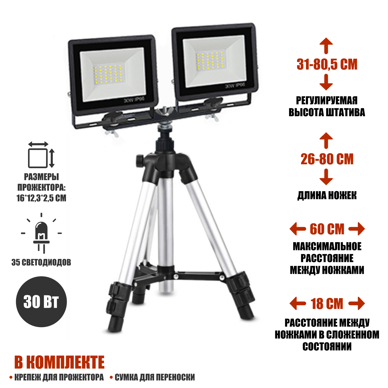 Прожекторы светодиодные 30Вт, 2 шт, на штативе строительном 3110-PRJ-PL2V элевационном интересное: