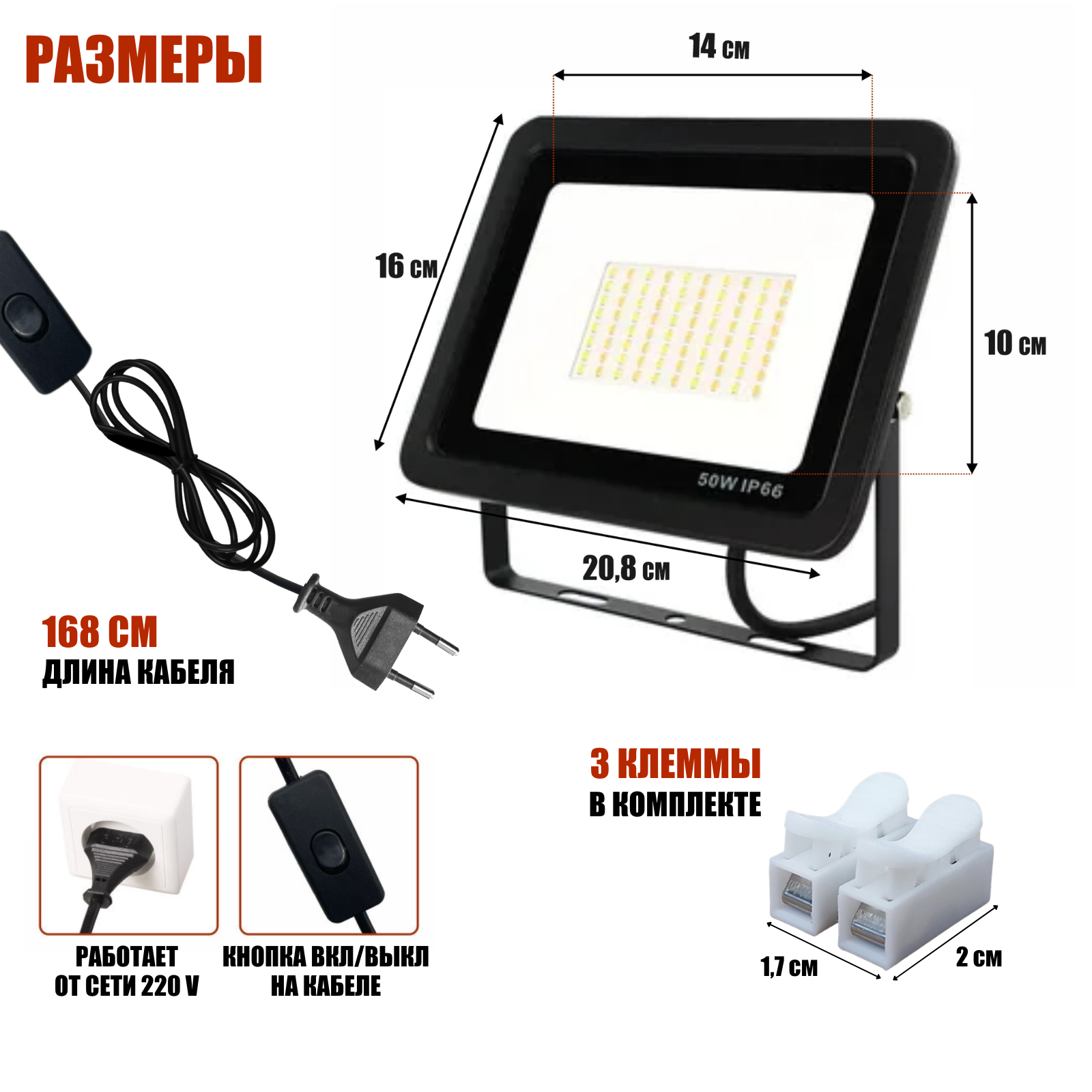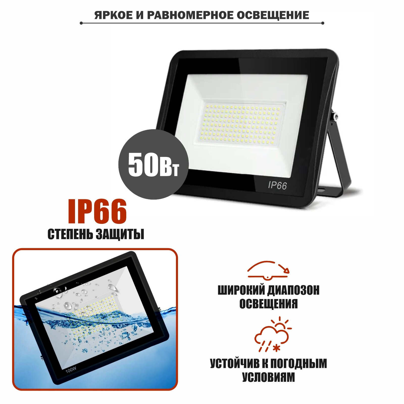 Прожектор LEDS POWER светодиодный (серия E027 пластик), IP65, 6000K, 50 Вт, светильник/фонарь уличный/внутренний