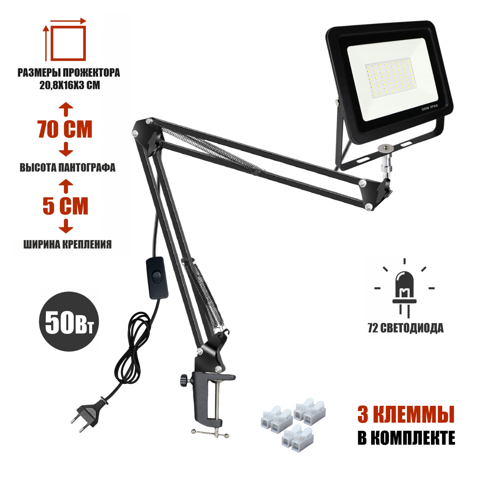 Светодиодный прожектор 50Вт с настольным креплением пантограф NB и кабелем 168 см интересное: