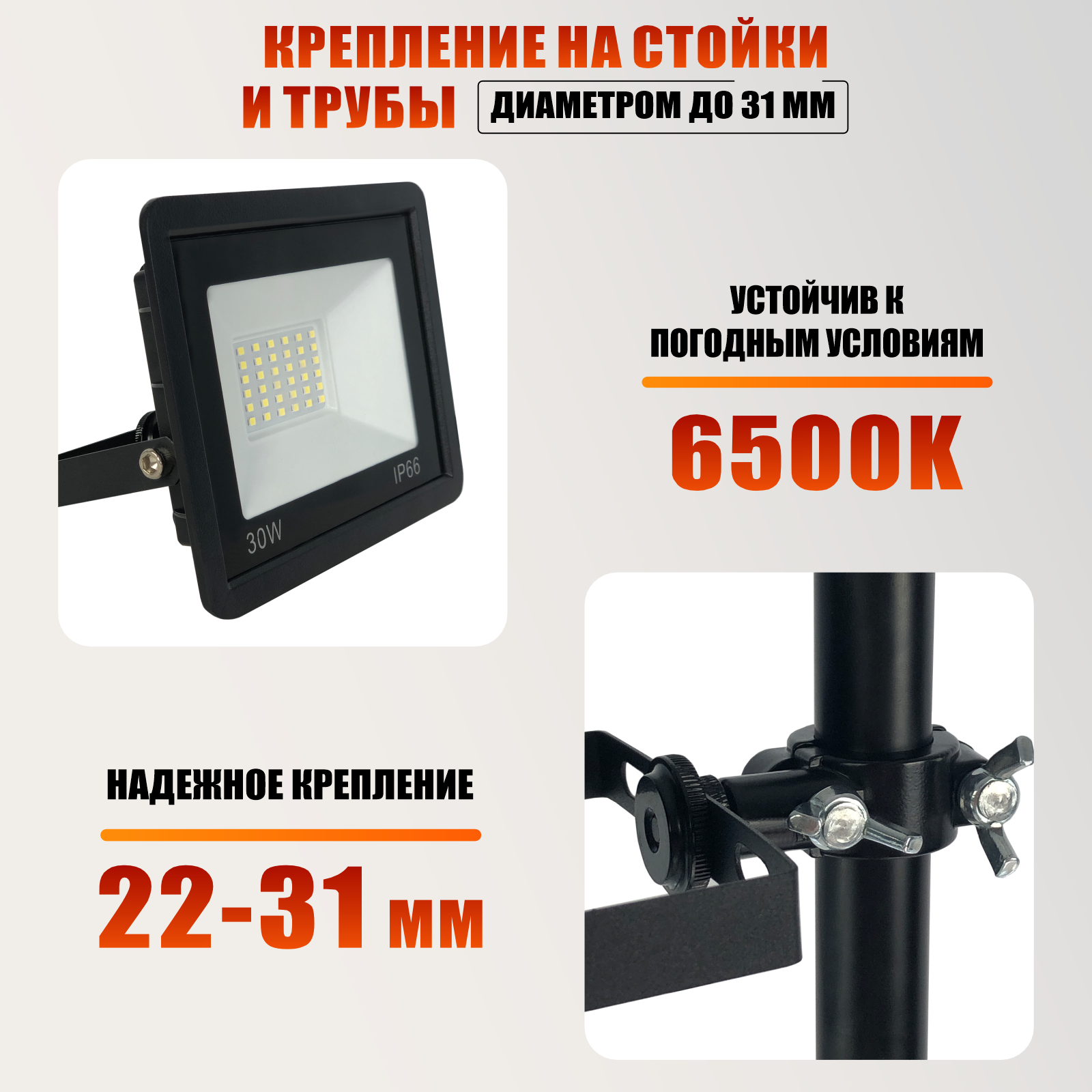 Прожектор 30 Вт, 6500K, на кронштейне с зажимом до 31 мм интересное:
