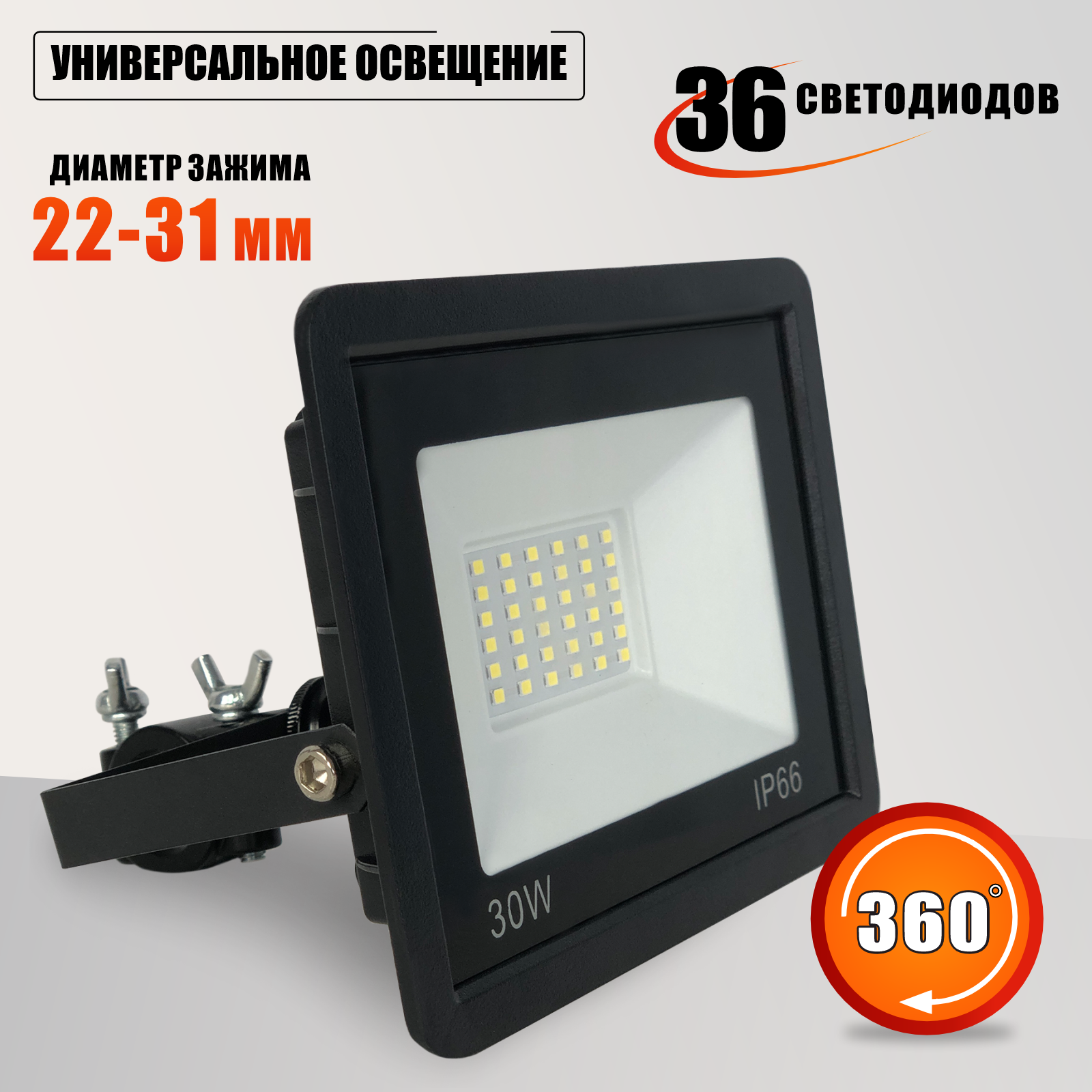 Купить Прожектор 30 Вт, 6500K, на кронштейне с зажимом до 31 мм