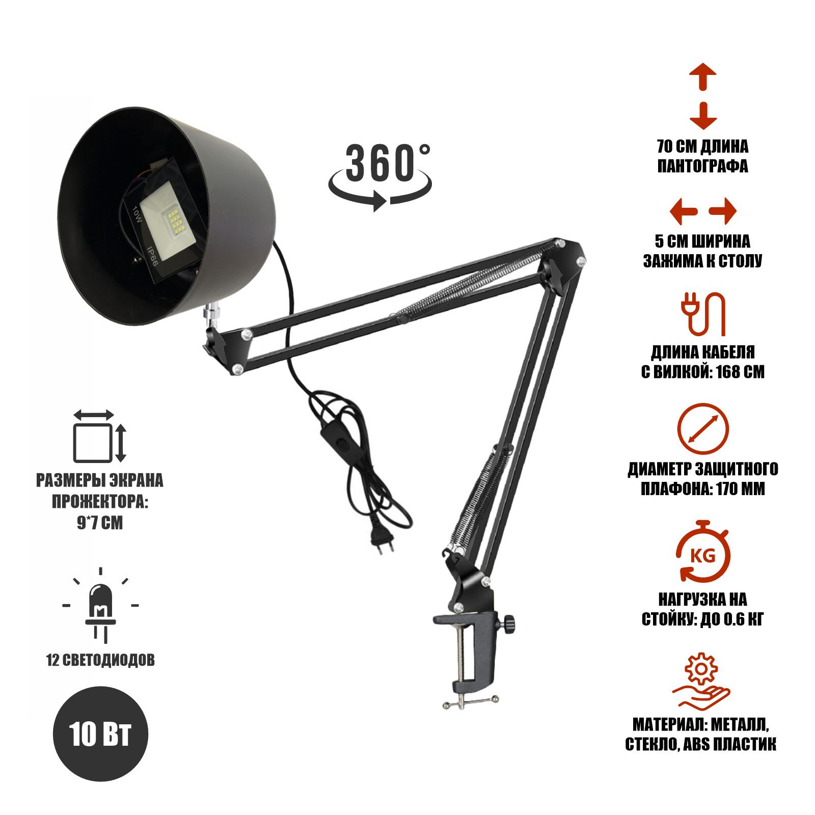 Прожектор светодиодный 10Вт с настольным креплением NBS-BCAP и черным защитным плафоном на усиленной струбцине интересное: