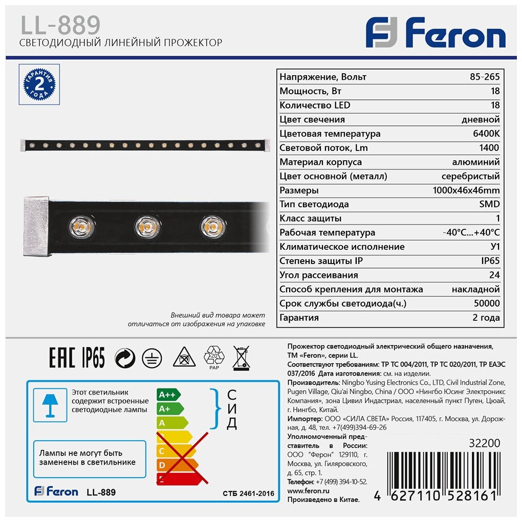 Светодиодный линейный прожектор для подсветки стен Feron LL-889 18W, 6400К, 85-265V IP65 интересное: