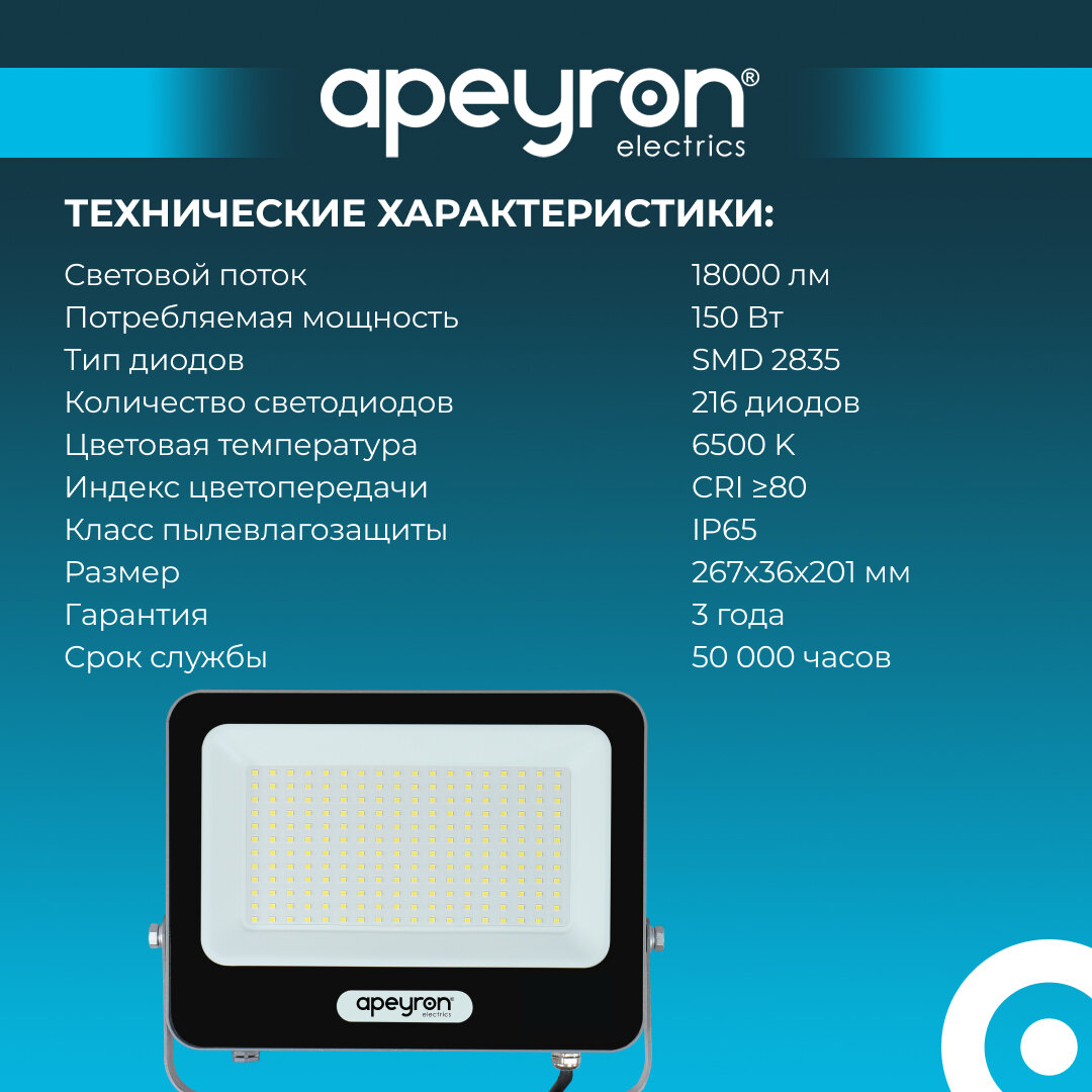 СохранитьПрожектор светодиодный Apeyron 05-49, 150Вт, 230В/50Гц, 18000лм, 6500К, IP65, 267х36х201, алюминий, серый интересное: