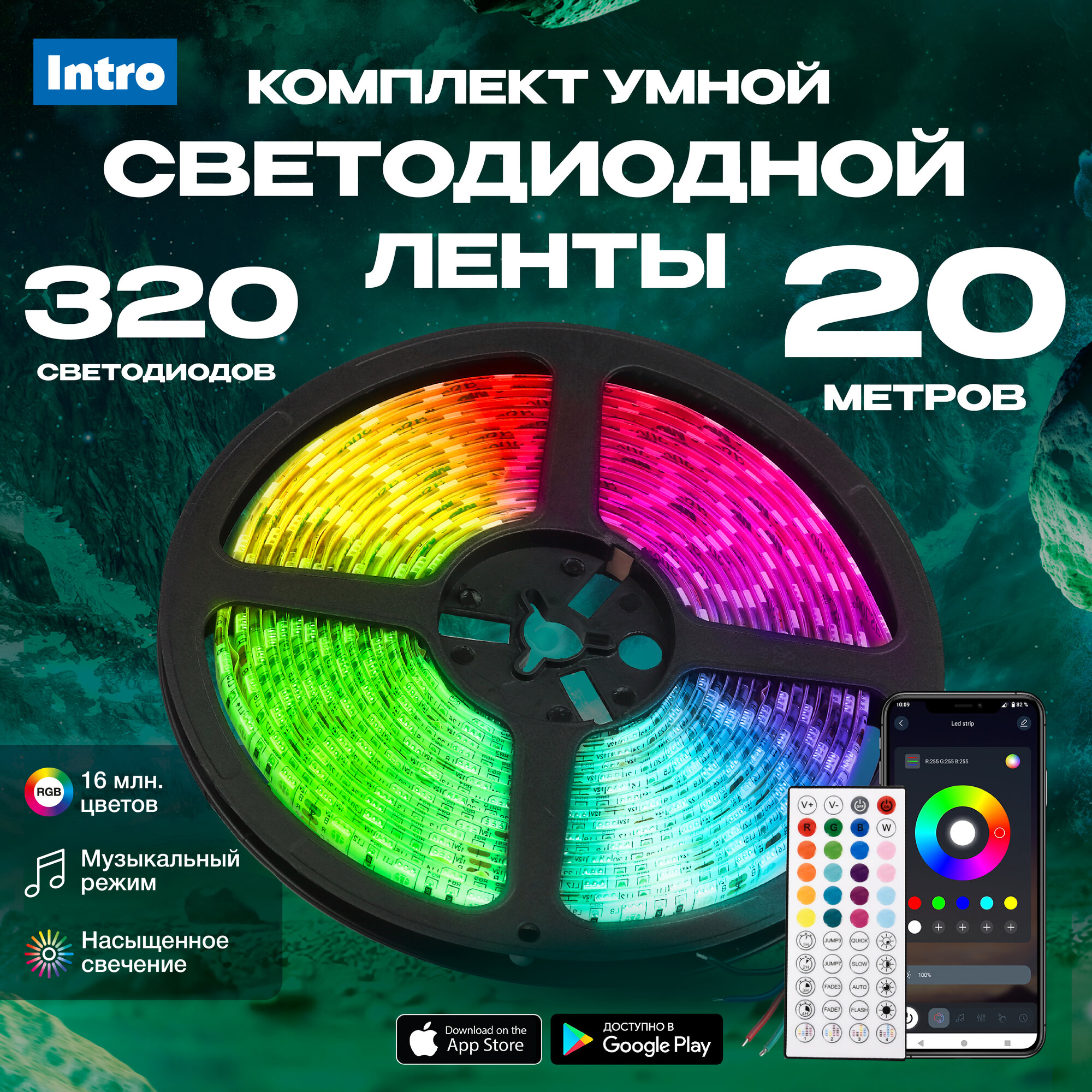 Купить Светодиодная лента Intro 5050Kit, с контроллером, многоцветная, RGB, 20м