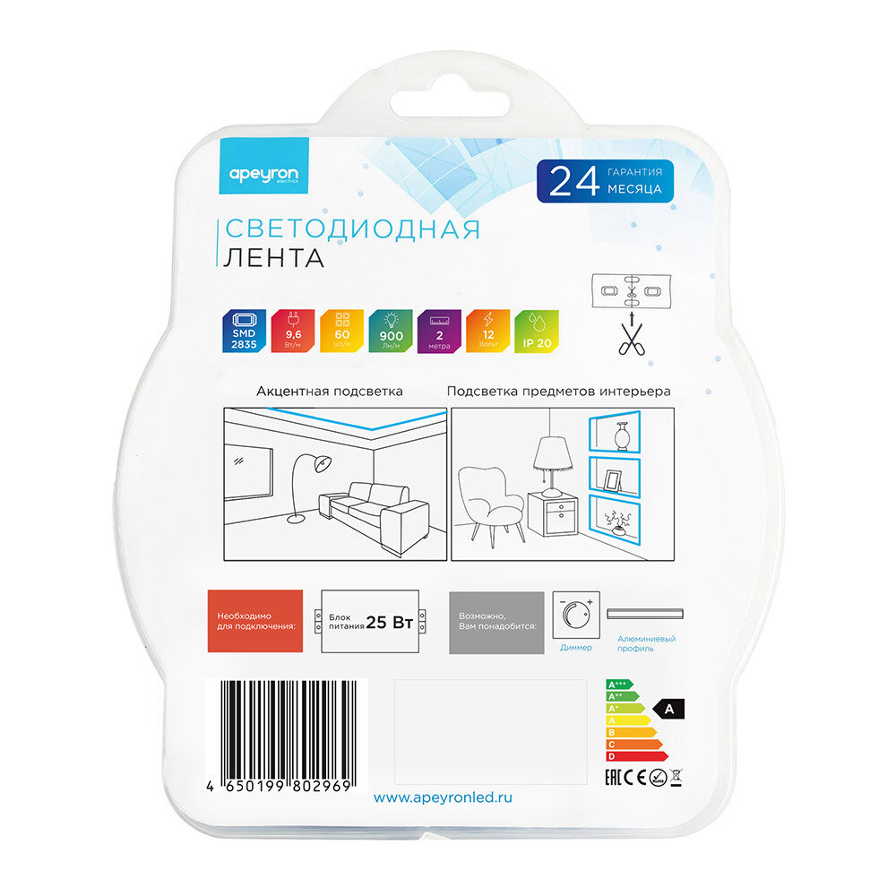 Лента светодиодная SMD 2835 6500К 12 В 9,6 Вт/м 2 м IP20 Apeyron (222BL) интересное: