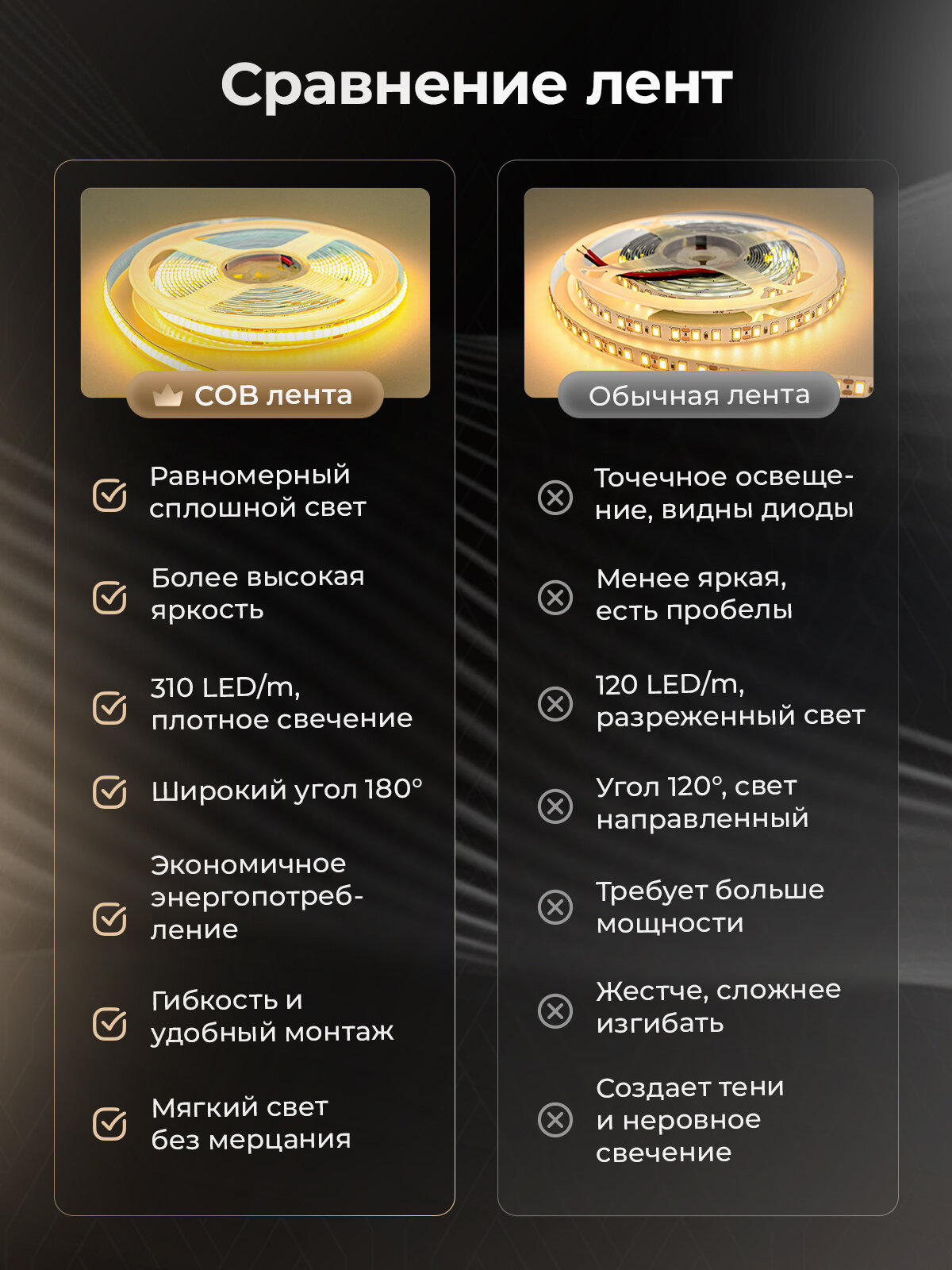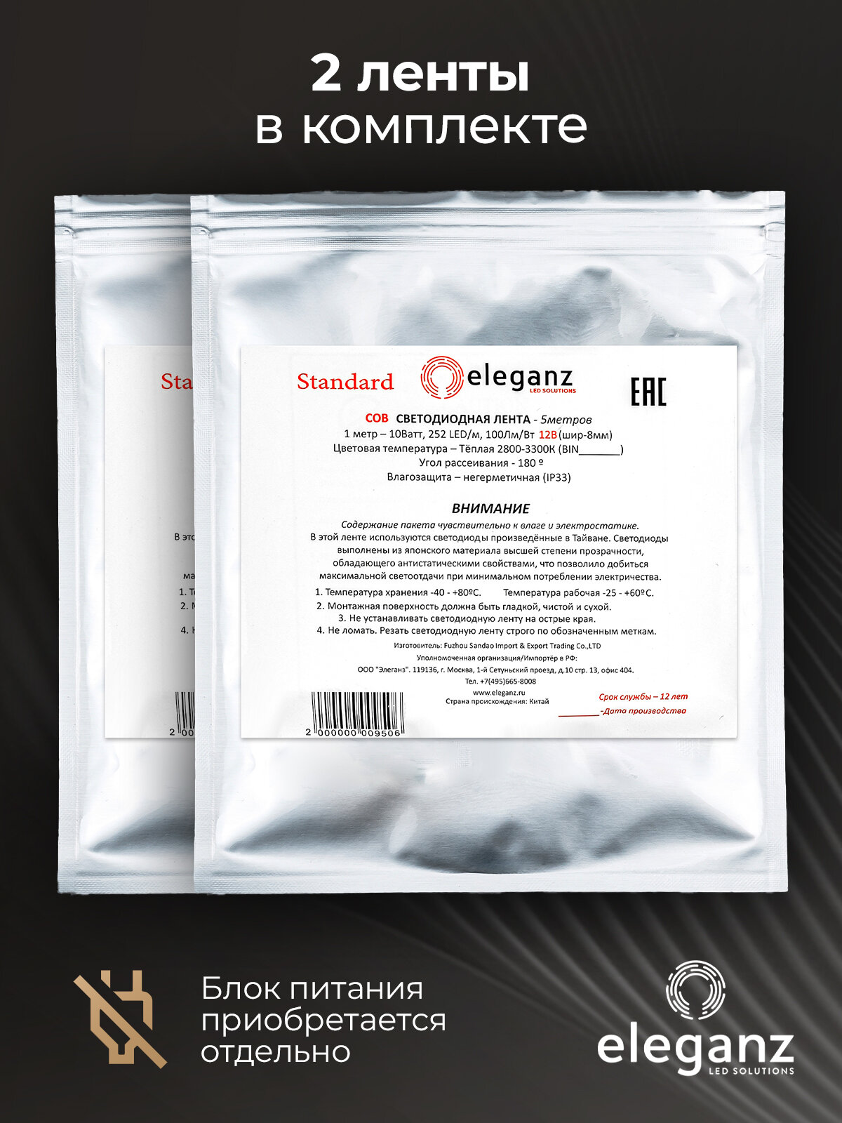Светодиодная лента (комплект) СОВ Standard "Eleganz 12В" на самоклеящейся основе, 8 Вт , 310 LED, IP33 Теплый белый свет. Лента 10м (2шт. по 5 метров)