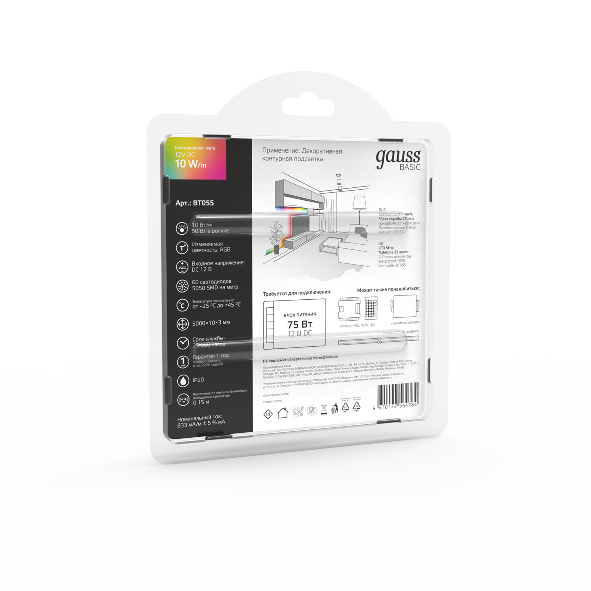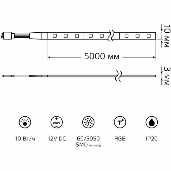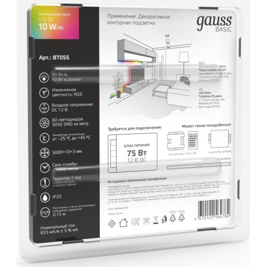 Светодиодная лента Gauss Basic LED 5050/60 12V 10W/m 700lm/m RGB 10mm IP20 5m 1/100 интересное: